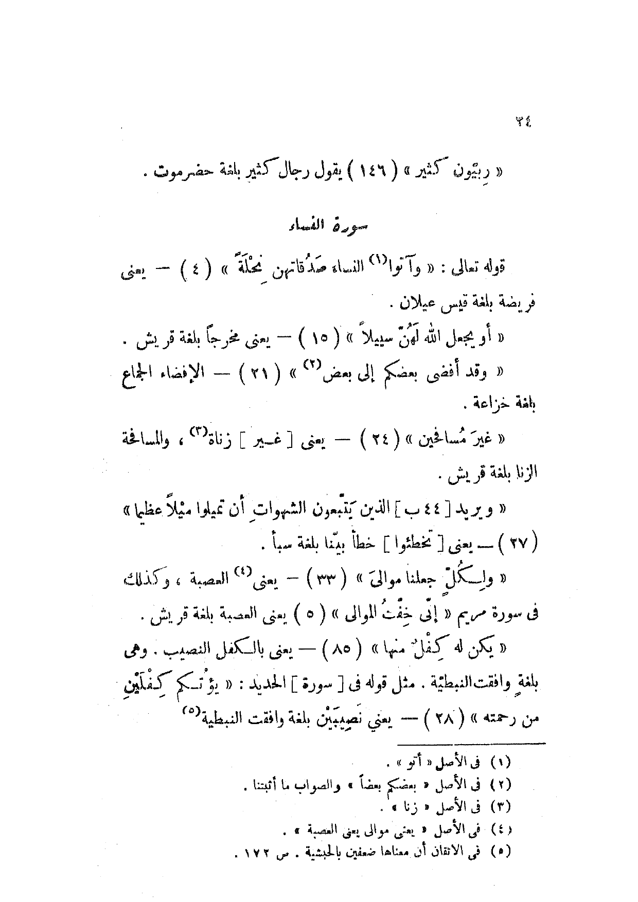 (يَكُن لَهُ كِفلٌ مِنها) - 85 - يعني بالكفل النصيب. وهي بلغة وافقت النبطية. مثل قوله في سورة الحديد: (يُؤتِكُم كِفلَينِ مِن رَحمَتِه) - 28 - يعني نصيبين لغة وافقت النبطية.
