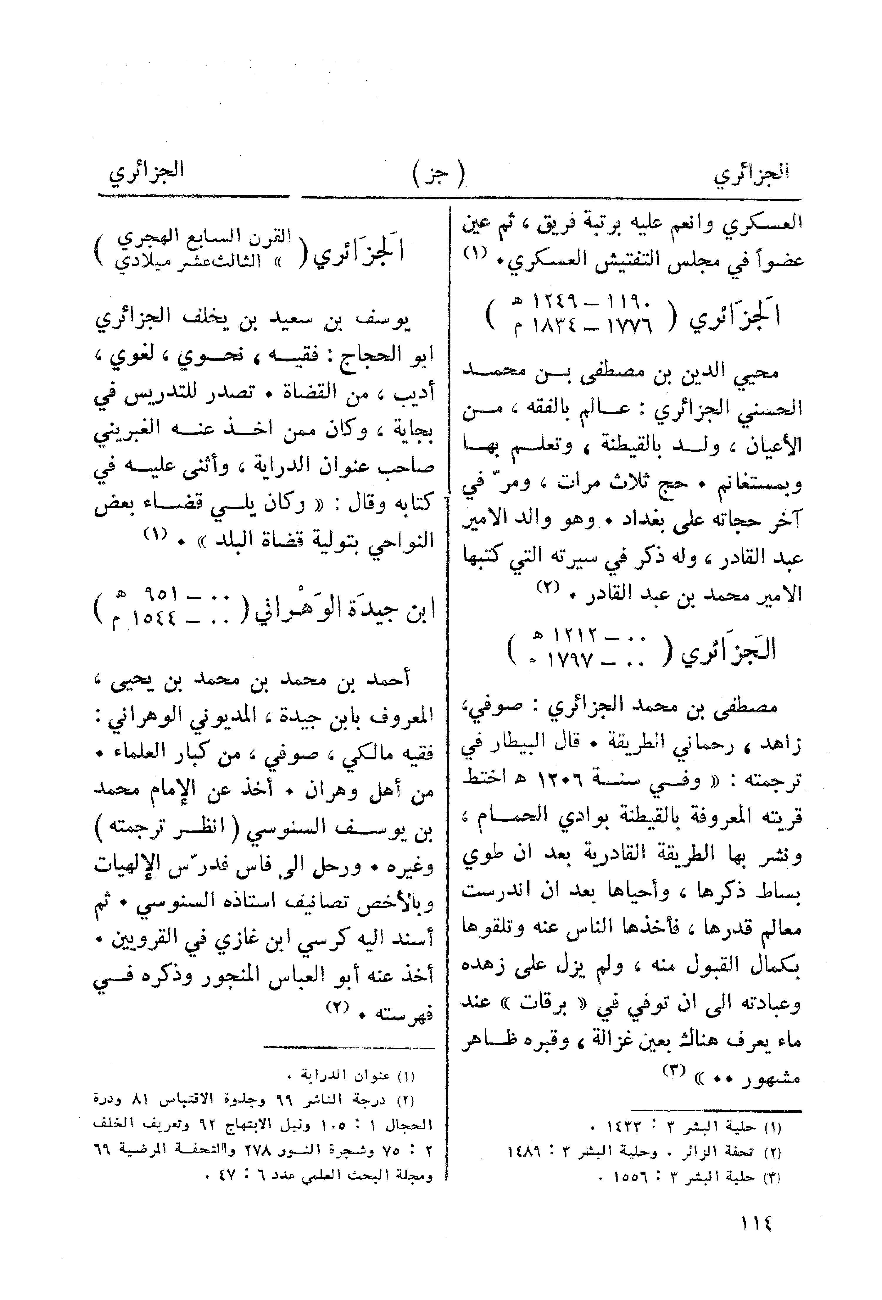 مصطفى بن محمد الجزائري: صوفي، زاهد، رحماني الطريقة. قال البيطار في ترجمته: "وفي سنة 1206هـ اختط قريته المعروفة بالقيطنة بوادي الحمام، ونشر بها الطريقة القاد! بئ بعد ان طوي بساوو ذكرها، وأحياها بعد ان اندرست معالم قدرها، فأخذها الناسيا عنه وتلقوها بكمال القبول منه، ولم يزل على زهده وعبادته الى ان توفي في "برقات" عند ماء يعرف هناك بعين غزالة، وقبره ظاهر مشهور .. " (¬3)