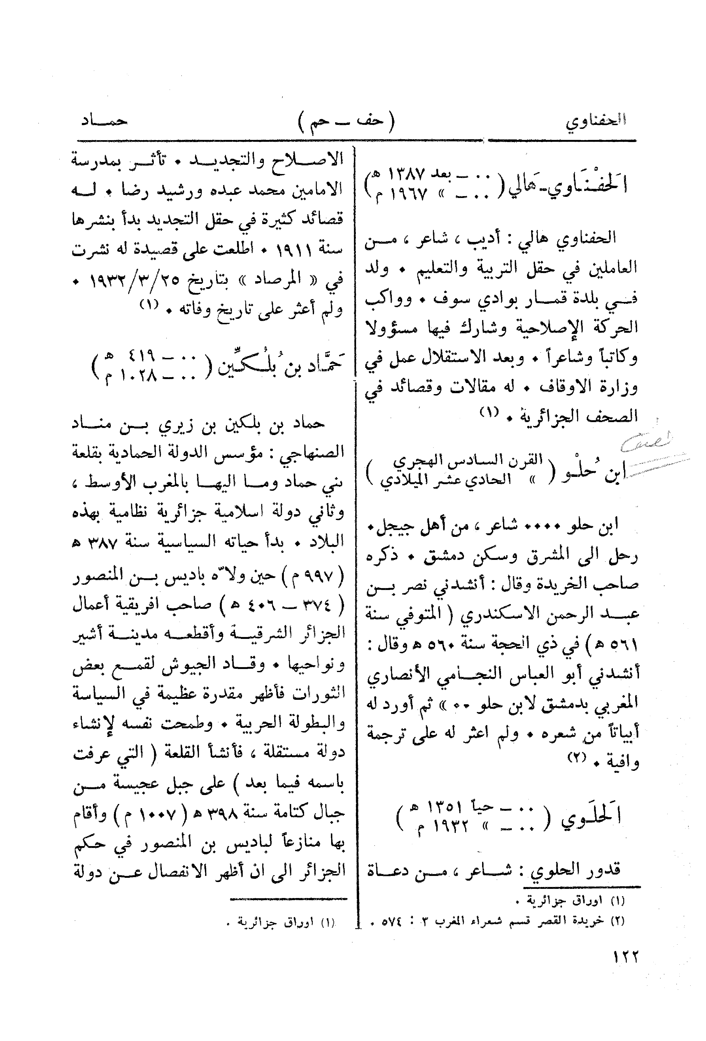 حماد بن بلكين بن زيري بن مناد الصنهاجي: مؤسس الدولة الحمادية بقلعة بني حماد وما اليها بالمغرب الأوسط، وثاني دولة اسلامية جزائرية نظامية بهذه البلاد. بدأ حياته السياسية سنة 387هـ (997م) حين ولاه باديس بن المنصور (374 - 406هـ) صاحب افريقية أعمال الجزائر الشرقيه وأقطعه مدينة أشير ونواحيها. وقاد الجيوش لقمع بعض الثورات فأظهر مقدرة عظيمة في السياسة والبطولة الحربية. وطمحت نفسه لإنشاء دولة مستقلة، فأنشأ القلعه (التي عرفت باسمه فيما بعد) على جبل عجيسة من جبال كتامة سنة 398هـ (1007م) وأقام بها منازعا لباديس بن المنصور في حكم الجزائر الى ان أظهر الانفصال عن دولة
