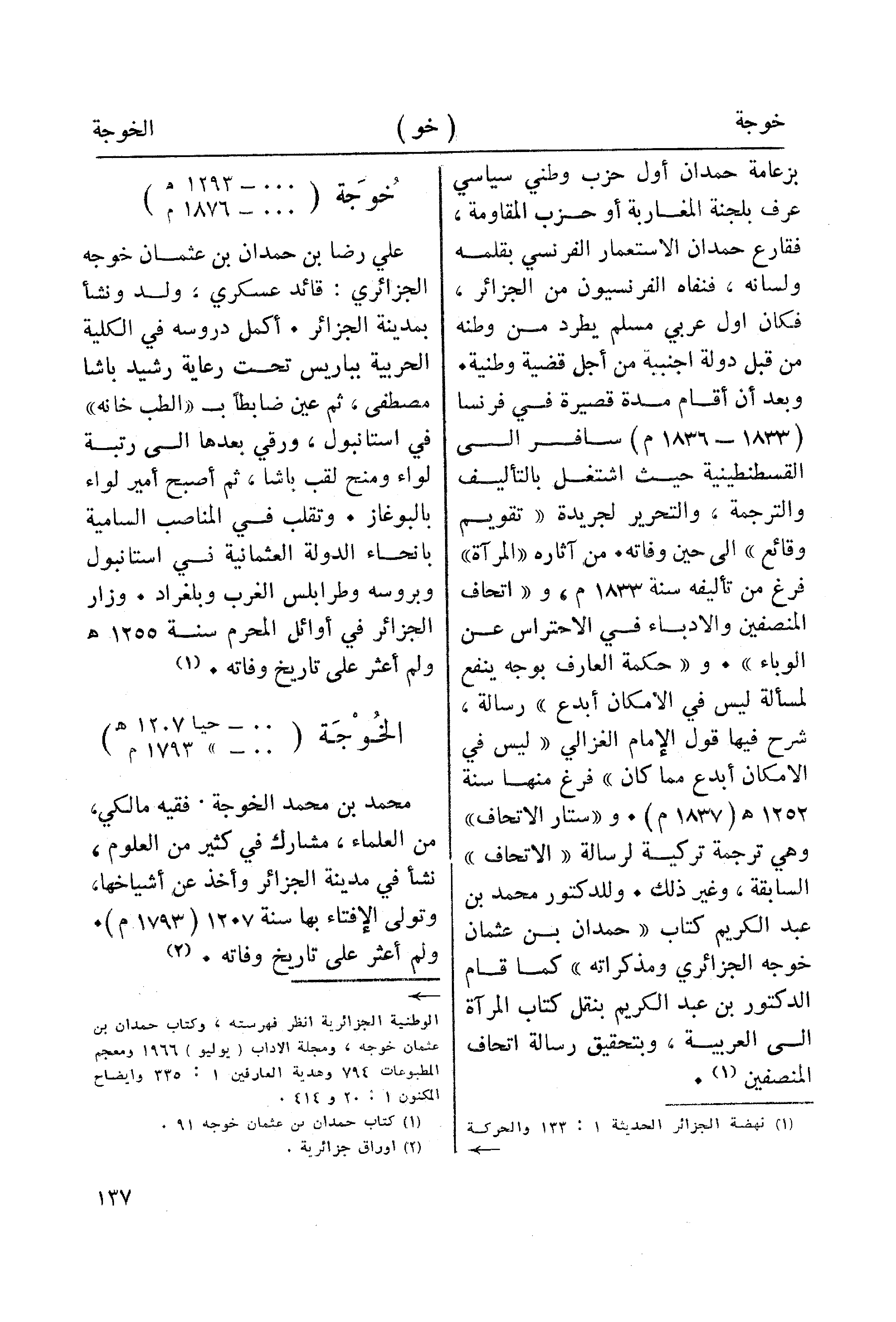 بزعامة حمدان أول حزب وطني سياسي عرف بلجنة المغاربة أو حزب المقاومة، فقارع حمدان الاستعمار الفرنسي بقلمه ولسانه، فنفاه الفرنسيون من الجزائر، فكان اول عربي مسلم يطرد من وطنه من قبل دولة اجنبية من أجل قضية وطنية. وبعد أن أقام مدة قصيرة في فرنسا (1833 - 1836م) سافر الى القسطنطينية حيث اشتغل بالتأليف والترجمة، والتحرير لجريدة " تقويم وقائع" الى حين وفاته. من آثاره "المرآة" فرغ من تأليفه سنة 1833م، و "اتحاف المنصفين والادباء في الاحتراس عن الوباء". و "حكمة العارف بوجه ينفع لمسألة ليس في الامكان أبدع" رسالة، شرح فيها قول الإمام الغزالي " ليس في الامكان أبدع مما كان " فرغ منها سنة 1252هـ (1837 م). و "ستار الاتحاف" وهي ترجمة تركية لرسالة "الاتحاف" السابقة، وغير ذلك. وللدكتور محمد بن عبد الكريم كتاب " حمدان بن عثمان خوجه الجزائري ومذكراته" كما قام الدكتور بن عبد الكريم بنقل كتاب المرآة الى العربية، وبتحقيق رسالة اتحاف المنصفين (¬1).
