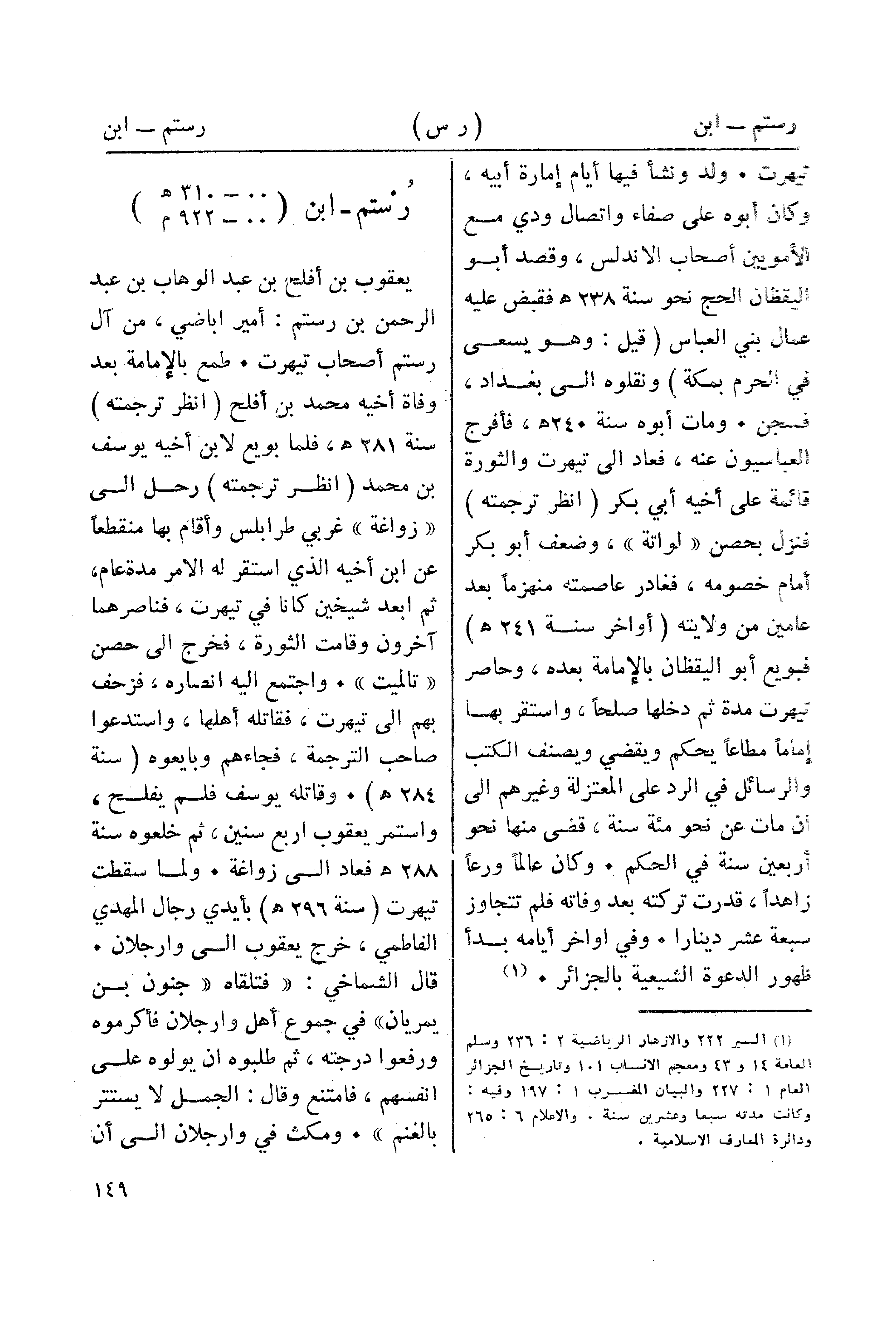 يعقوب بن أفلح بن عبد الوهاب بن عبد الرحمن بن رستم: أمير اباضي، من آل رستم أصحاب تيهرت. طمع بالإمامة بعد وفاة أخيه محمد بن أفلح (انظر ترجمته) سنة 281هـ، فلما بويع لابن أخيه يوسف بن محمد (انظر ترجمته) رحل الى "زواغة" غربي طرابلس وأقام بها منقطعا عن ابن أخيه الذي استقر له الامر مدة عام، ثم ابعد شيخين كانا في تيهرت، فناصرهما آخرون وقامت الثورة، فخرخ إلى حصن "تالميت". واجتمع اليه انصاره، فزحف بهم الى تيهرت، فقاتله أهلها، واستدعوا صاحب الترجمة، فجاءهم وبايعوه (سنة 284هـ). وقاتله يوسف فلم يفلح، واستمر يعقوب أربع سنين، ثم خلعوه سنة 288هـ فعاد الى زواغة. ولما سقطت تيهرت (سنة 296هـ) بأيدي رجال المهدي الفاطمي، خرج يعقوب الى وارجلون. قال الشماخي: "فتلقاه (جنون بن يمريان) في جموع أهل وارجلان فأكرموه ورفعوا درجته، ثم طلبوه ان يولوه على أنفسهم، فامتنع وقال: الجمل لا يستتر بالغنم". ومكث في وارجلان الى أن