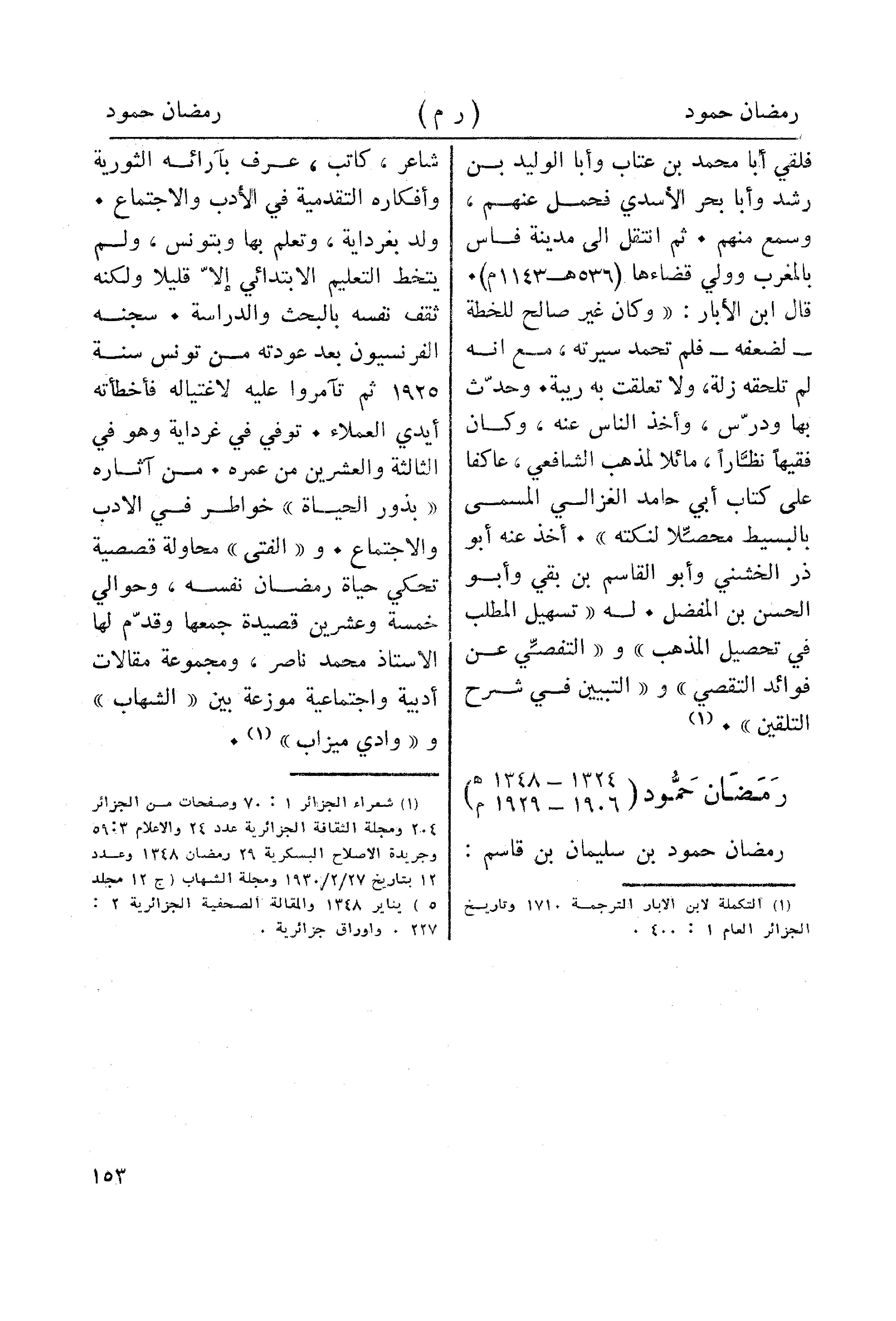 (¬1) شعراء الجزائر 1: 70 وصفحات من الجزائر 204 ومجلة الثقافة الجزائرية عدد 24 والاعلام 3: 59 وجريدة الاصلاح البسكرية 29 رمضان 1348 وعدد 12 بتاريخ 27/ 2/ 1930 ومجلة الشهاب (ج 12 مجلد 5) يناير 1348 والمقالة الصحفية الجزائرية 2: 227. وأوراق جزائرية.