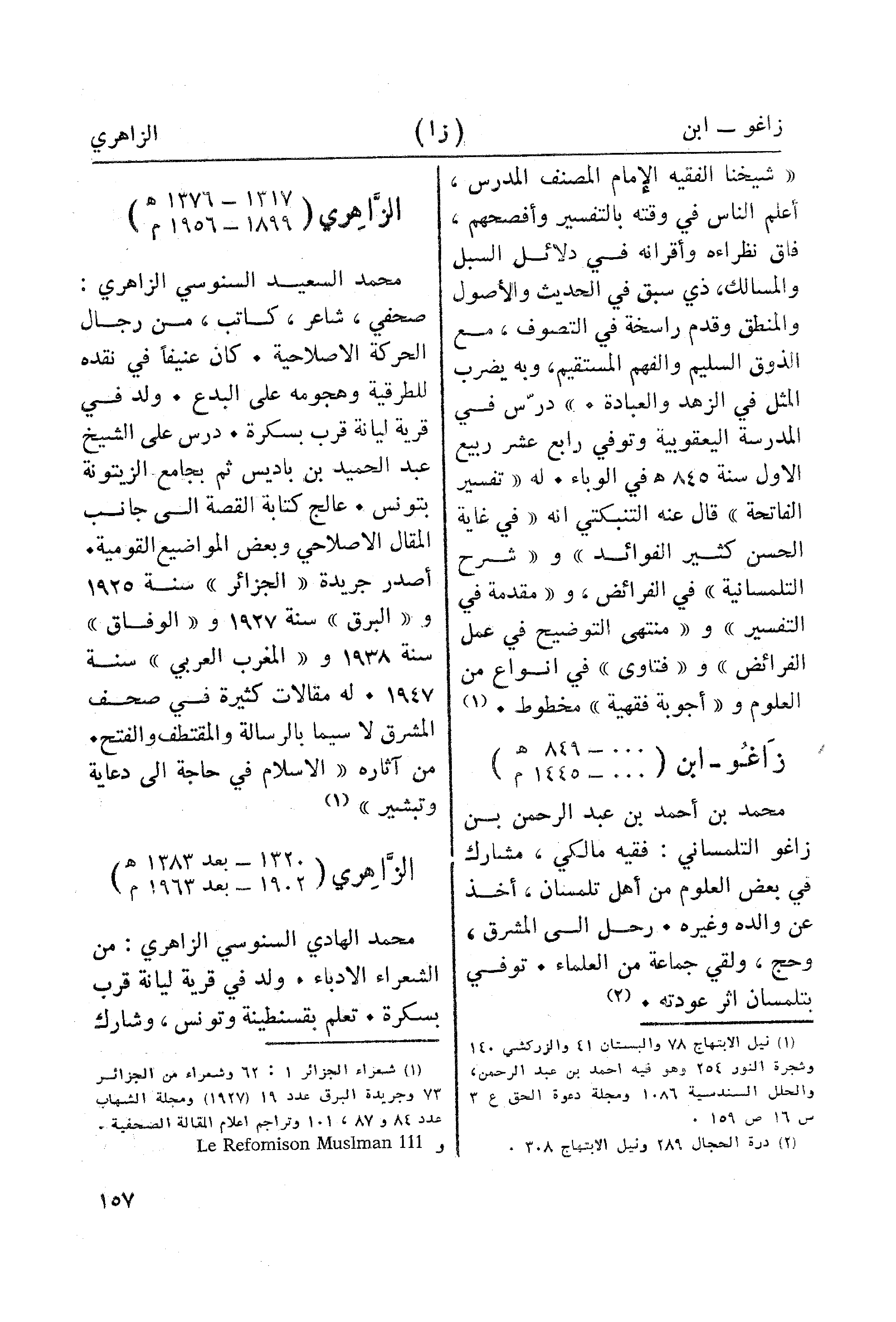 محمد السعيد السنوسي الزاهري: صحفي، شاعر، كاتب، من رجال الحركة الاصلاحية. كان عنيفا في نقده للطرقية وهجومه على البدع. ولد في قرية ليانة قرب بسكرة. درس على الشيخ عبد الحميد بن باديس ثم بجامع الزيتونة بتونس. عالج كتابة القصة الى جانب المقال الاصلاحي وبعض المواضيع القومية. أصدر جريدة "الجزائر" سنة 1925 و" البرق " سنة 1927 و"الوفاق" سنة 1938 و"المغرب العربي" سنة 1947. له مقالات كثيرة في صحف المشرق لا سيما بالرسالة والمقتطف والفتح. من آثاره " الاسلام في حاجة الى دعاية وتبشير" (¬1).