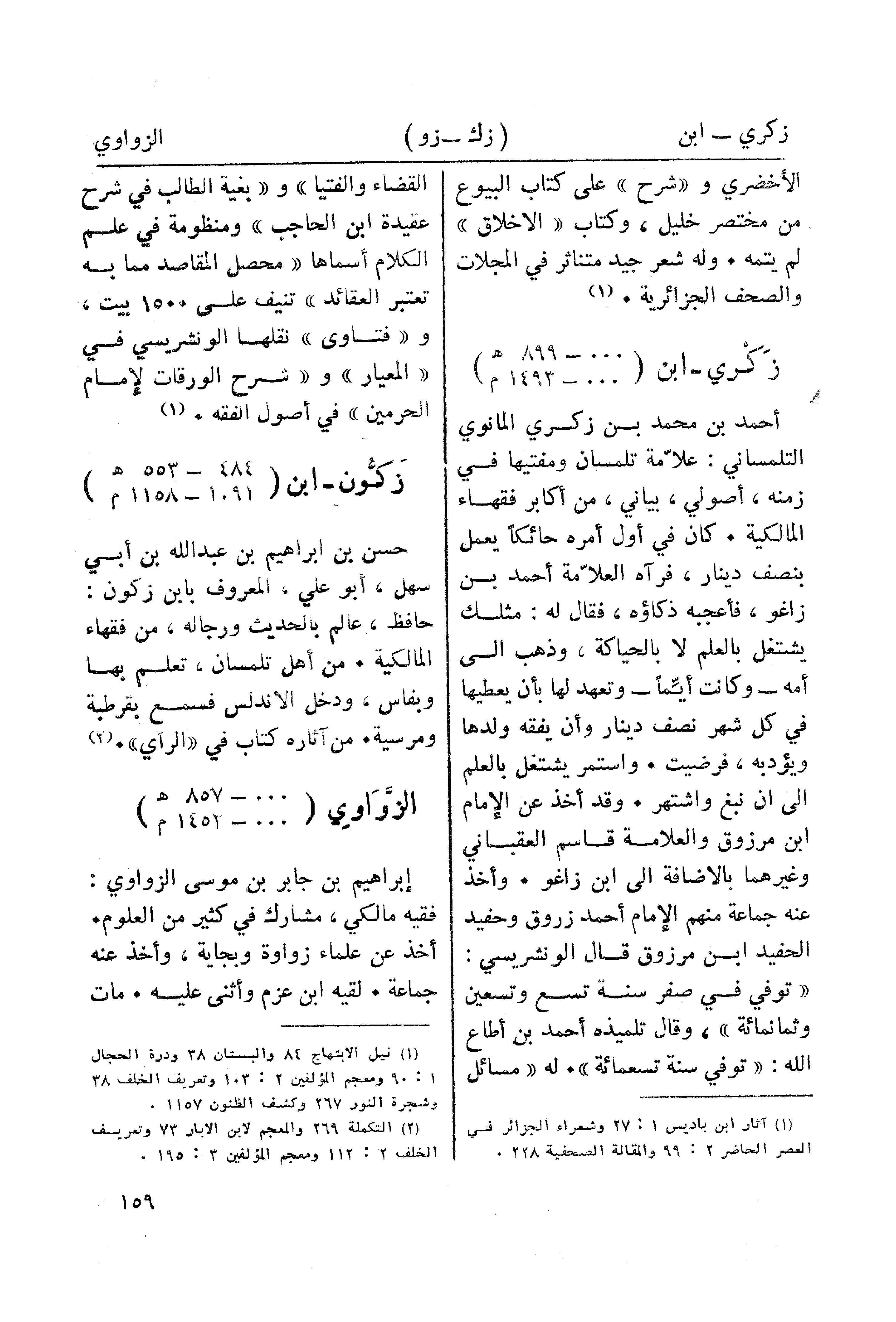 أحمد بن محمد بن زكري المانوي التلمساني: علامة تلمسان ومفتيها في زمنه، أصولي، بياني، من أكابر فقهاء المالكية. كان في أول أمره حائكا يعمل بنصف دينار، فرآه العلامة أحمد بن زاغو، فأعجبه ذكاؤه، فقال له: مثلك يشتغل بالعلم لا بالحياكة، وذهب الى أمه- وكانت أيما- وتعهد لها بأن يعطيها في كل شهر نصف دينار وأن يفقه ولدها ويؤدبه، فرضيت. واستمر يشتغل بالعلم الى ان نبغ واشتهر. وقد أخذ عن الإمام ابن مرزوق والعلامة قاسم العقباني وغيرهما بالاضافة الى ابن زاغو. وأخذ عنه جماعة منهم الإمام أحمد زروق وحفيد الحفيد ابن مرزوق قال الونشريسي: " توفي في صفر سنة تسع وتسعين وثمانمائة"، وقال تلميذه أحمد بن أطاع الله: " توفي سنة تسعمائة". له "مسائل