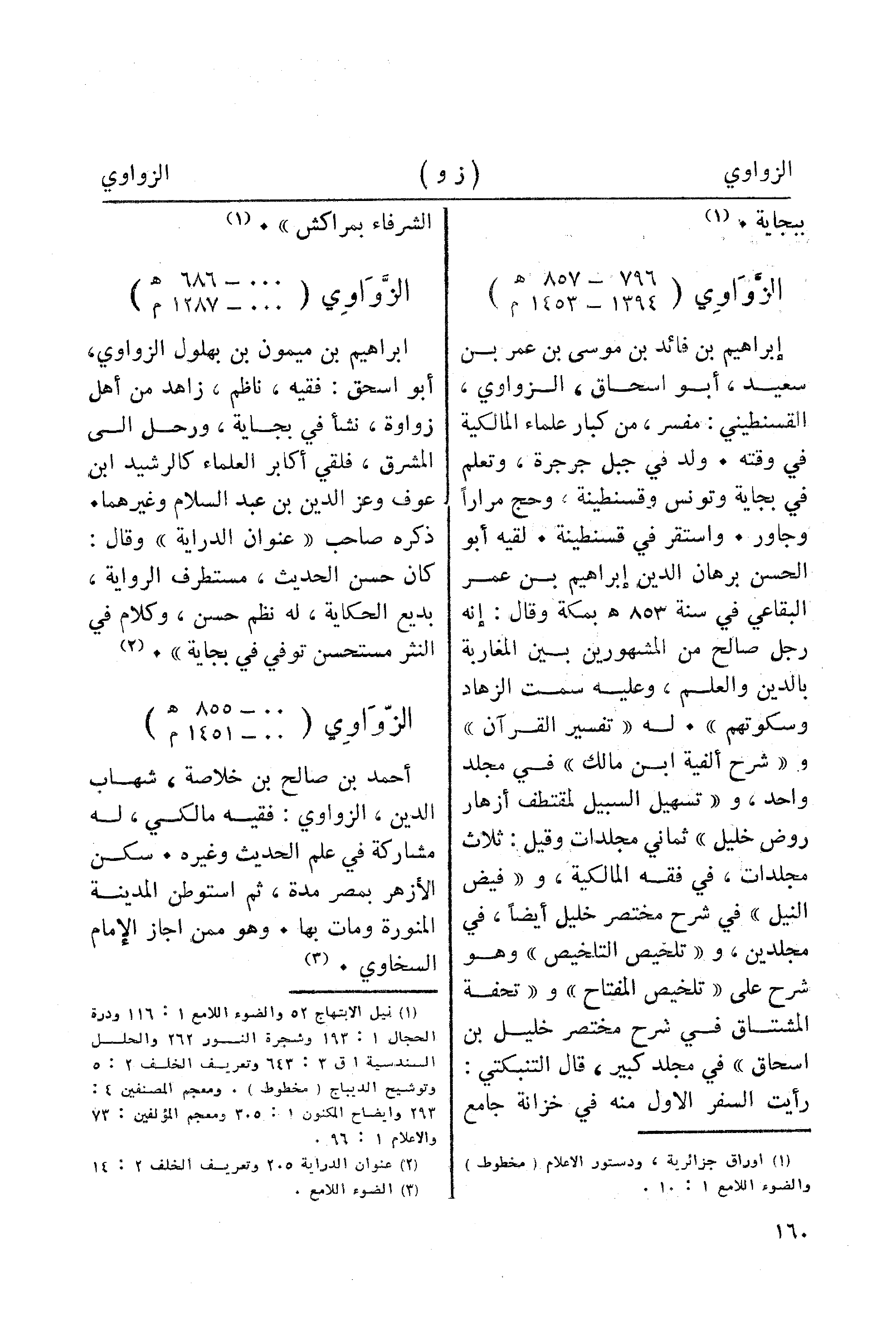 إبراهيم بن فائد بن موسى بن عمر بن سعيد، أبو اسحاق، الزواوي، القسنطيني: مفسر، من كبار علماء المالكية في وقته. ولد في جبل جرجرة، وتعلم في بجاية وتونس قسنطينة، وحج مرارا وجاور. واستقر في قسنطينة. لقيه أبو الحسن برهان الدين إبراهيم بن عمر البقاعي في سنة 853 هـ بمكة وقال: إنه رجل صالح من المشهورين بين المغاربة بالدين والعلم، وعليه سمت الزهاد وسكوتهم". له "تفسير القرآن" و"شرح ألفية ابن مالك " في مجلد واحد، و"تسهيل السبيل لمقتطف أزهار روض خليل" ثماني مجلدات وقيل: ثلاث مجلدات، في فقه المالكية، و"فيض النيل" في شرح مختصر خليل أيضا، في مجلدين، و"تلخيص التلخيص" وهو شرح على "تلخيص المفتاح" و"تحفة المشتاق في شرح مختصر خليل بن اسحاق " في مجلد كبير، قال التنبكتي: رأيت السفر الاول منه في خزانة جامع