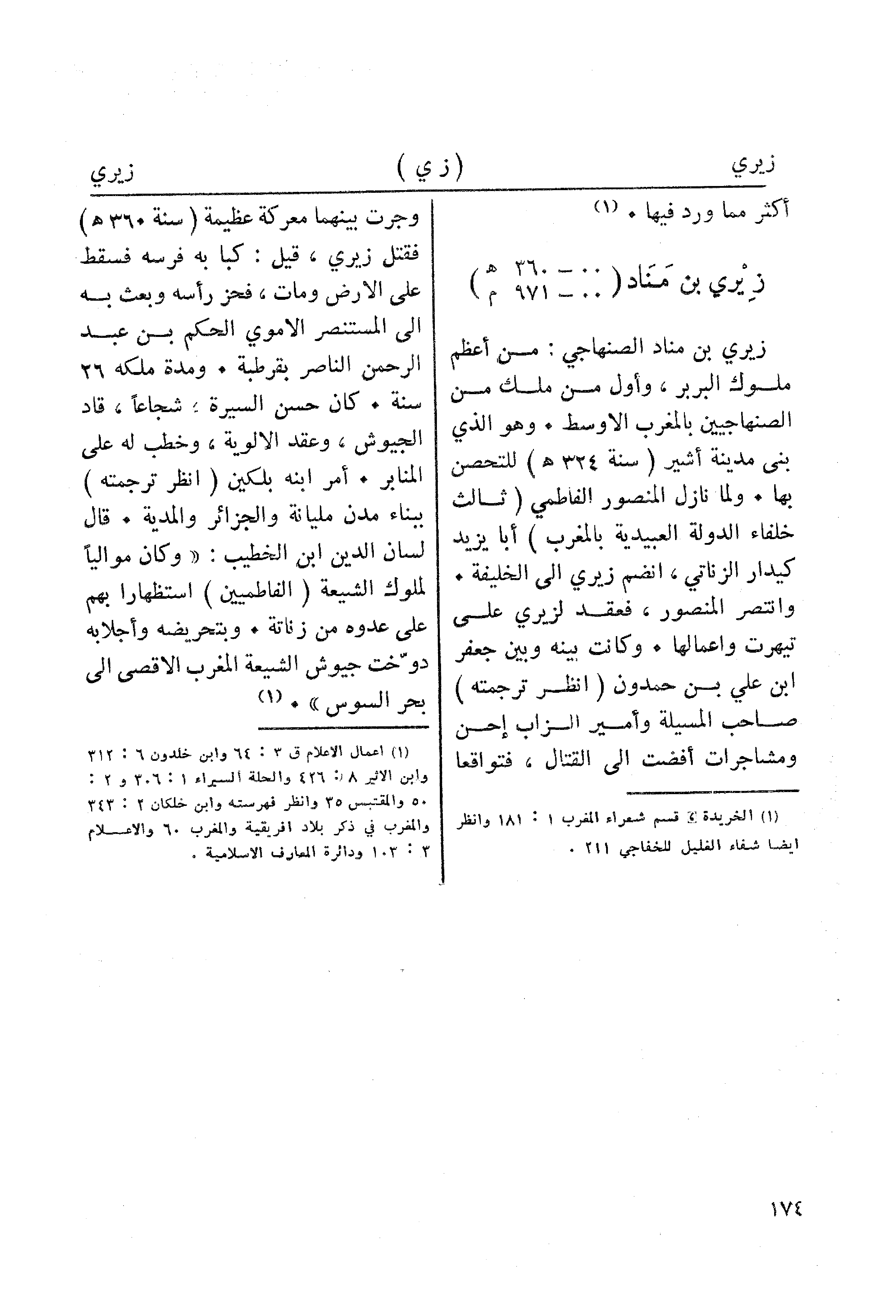 زيري بن مناد الصنهاجي: من أعظم ملوك البربر، وأول من ملك من الصنهاجيين بالمغرب الاوسط. وهو الذي بنى مدينة أشير (سنة 324 هـ) للتحصن بها. ولما نازل المنصور الفاطمي (ثالث خلفاء الدولة العبيدية بالمغرب) أبا يزيد كيدار الزناتي، انضم زيري إلى الخليفة. وانتصر المنصور، فعقد لزيري على تيهرت واعمالها. وكانت بينه وبين جعفر ابن علي بن حمدون (انظر ترجمته) صاحب المسيلة وأمير الزاب إحن ومشاجرات أفضت الى القتال، فتواقعا