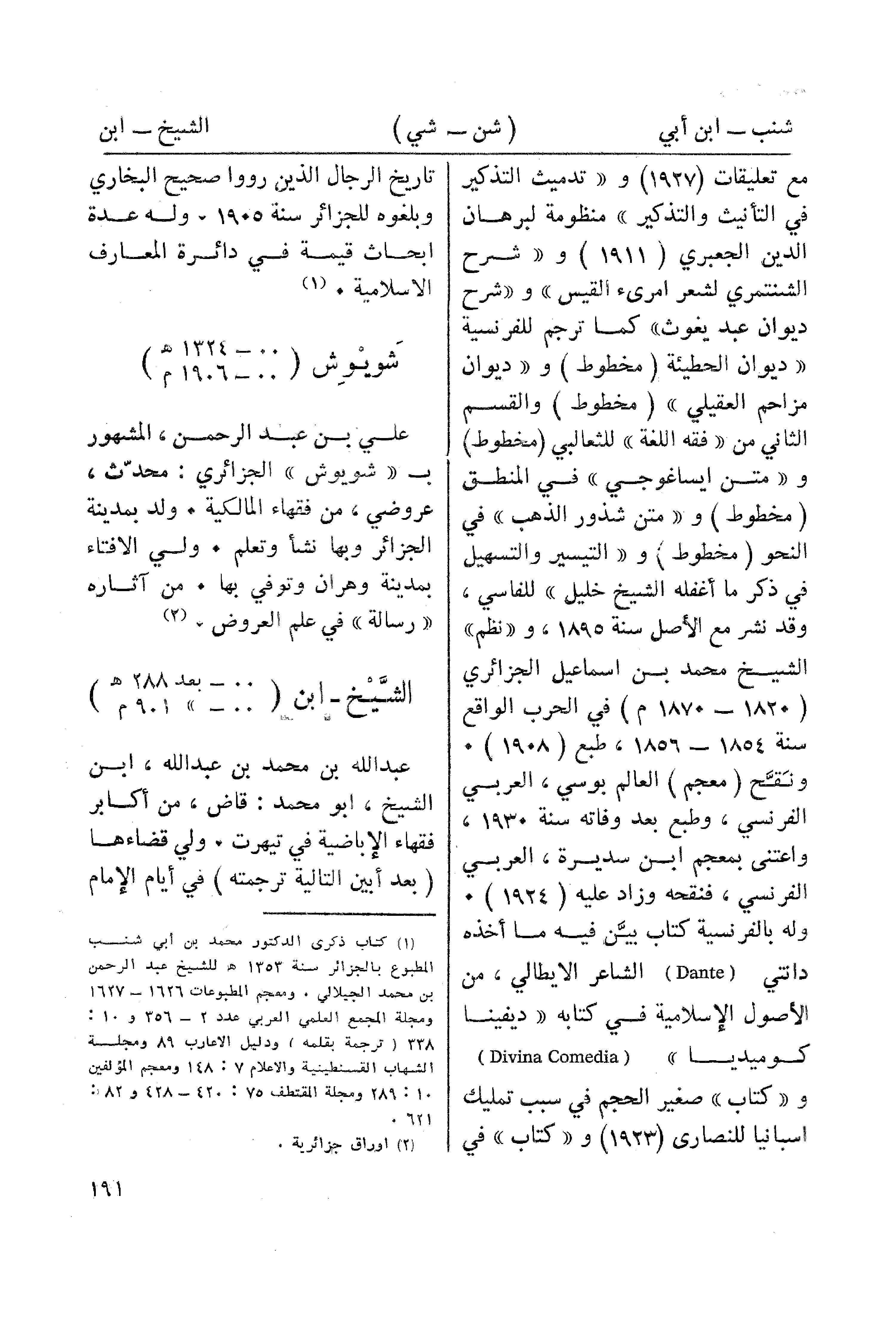 (¬1) كتاب ذكرى الدكتور محمد بن أبي شنب المطبوع بالجزائر سنة 1353هـ للشيخ عبد الرحمن بن محمد الجيلالى. ومعجم المطبوعات 1626 - 1627 ومجلة المجمع العلمي العربي عدد 2 - 356 و 10: 338 (ترجمة بقلمه) ودليل الاعارب 89 ومجلة الشهاب الفسنطينية والاعلام 7: 148 ومعجم المؤلفين 10: 289 ومجلة المقتطف 75: 420 - 428 و 82: 621.