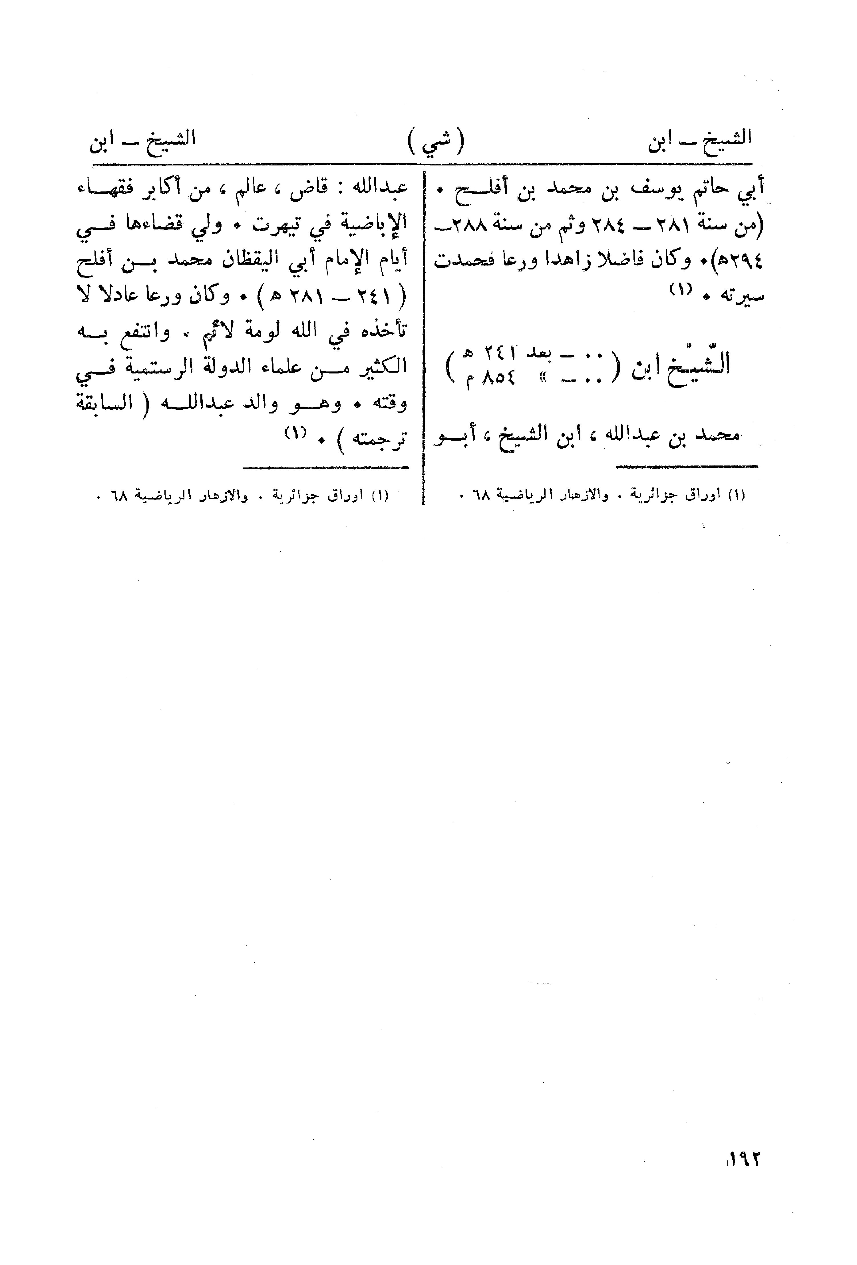 عبد الله: قاض، عالم، من أكابر فقهاء الإباضية في تيهرت. ولي قضاءها في أيام الإمام أبي اليقظان محمد بن أفلح (241 - 281 هـ). وكان ورعا عادلا لا تأخذه في الله لومة لائم. وانتفع به الكثير من علماء الدولة الرستمية في وقته. وهو والد عبد الله (السابقة ترجمته). (¬1)