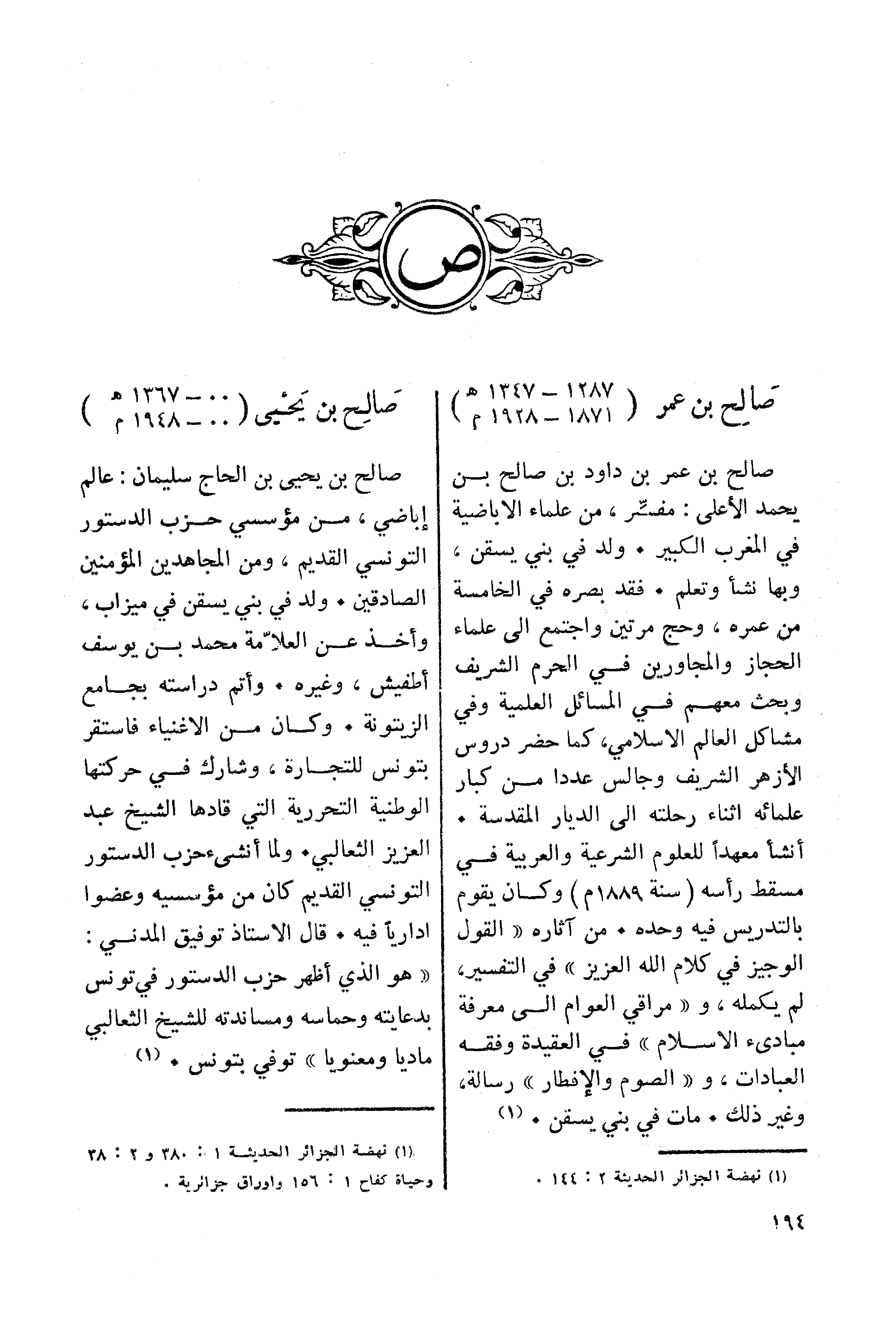 صالح بن يحيى بن الحاج سليمان: عالم إباضي، من مؤسسي حزب الدستور التونسي القديم، ومن المجاهدين المؤمنين الصادقين. ولد في بني يسقن في ميزاب، وأخذ عن العلامة محمد بن يوسف أطلفيش، وغيره. وأتم دراسته بجامع الزيتونة. وكان من الاغنياء فاستقر بتونس للتجارة، وشارك في حركتها الوطنية التحررية التي قادها الشيخ عبد العزيز الثعالبي. ولما أنشىء حزب الدستور التونسي القديم كان من مؤسسيه وعضوا إداريا فيه. قال الاستاذ توفيق المدني: "هو الذي أظهر حزب الدستور في تونس بدعايته وحماسه ومساندته للشيخ الثعالبي ماديا ومعنويا" توفي بتونس. (¬1)