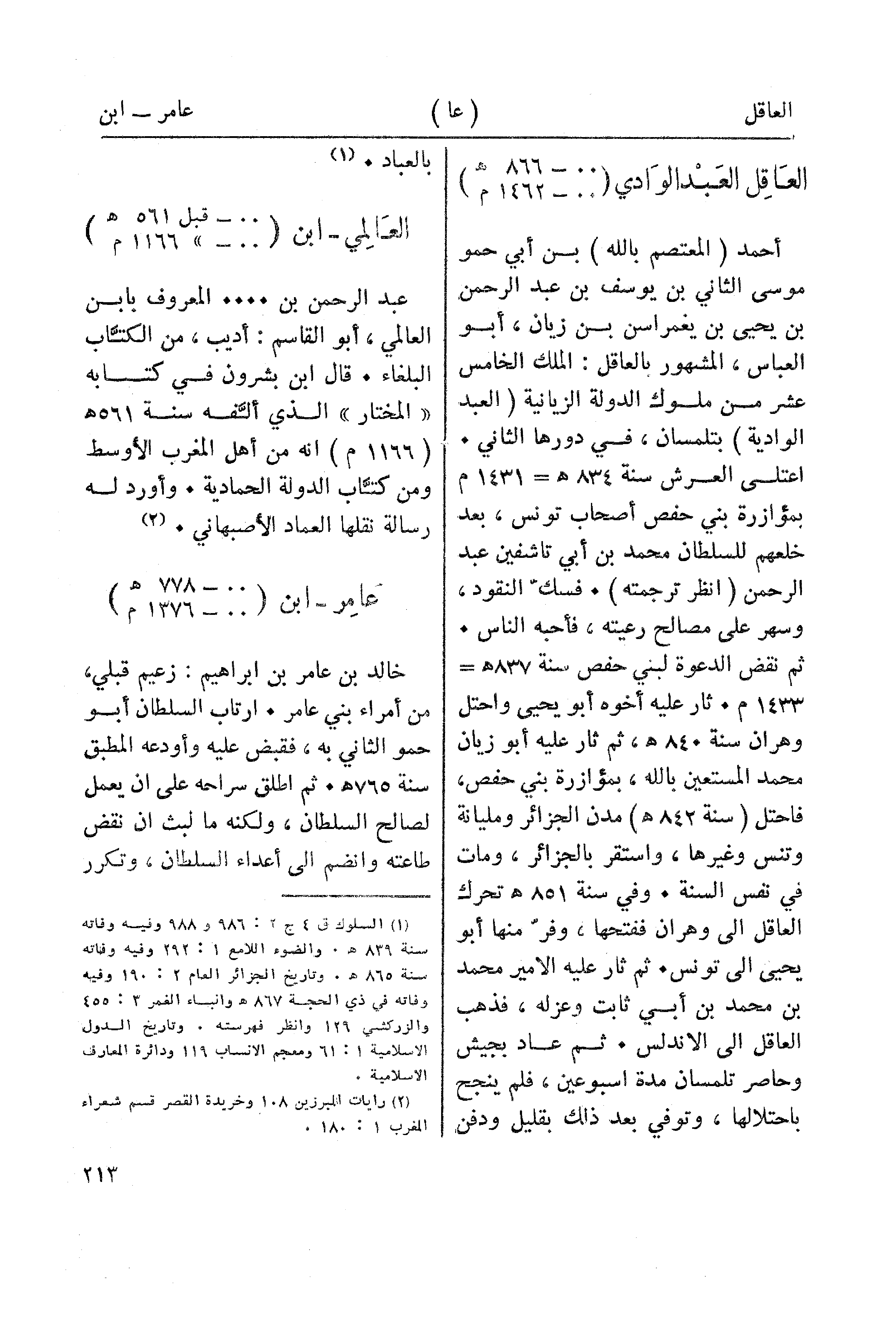 خالد بن عامر بن ابراهيم: زعيم قبلي، من أمراء بني عامر. ارتاب السلطان أبو حمو الثاني به، فقبض عليه وأودعه المطبق سنة 765هـ. ثم اطلق سراحه على ان يعمل لصالح السلطان، ولكنه ما لبث ان نقض طاعته وانضم الى أعداء السلطان، وتكرر
