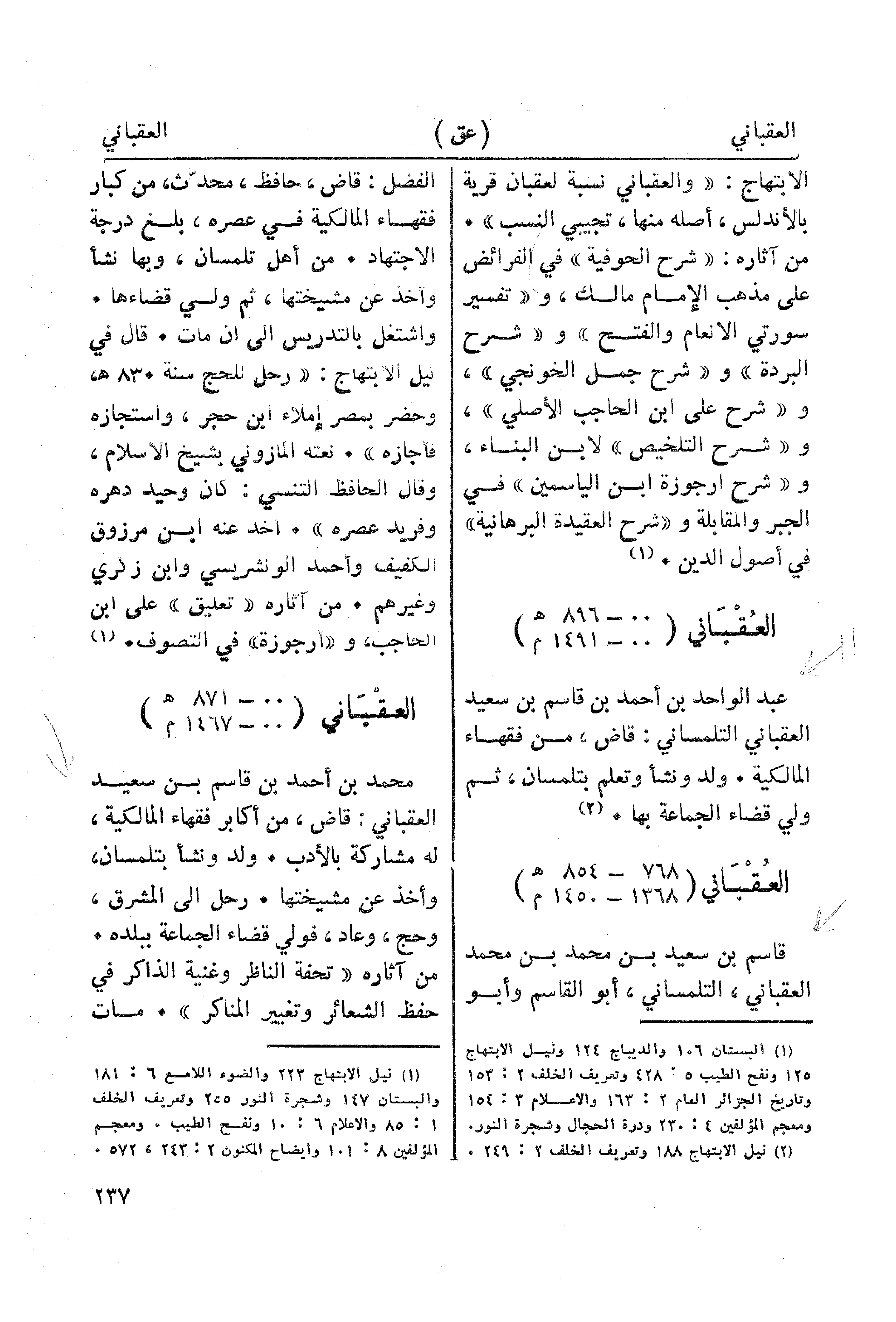 (¬1) نيل الابتهاج 223 والضوء اللامع 6: 181 والبسان 147 وشجرة النور 255 وتعريف الخلف 1: 85 والاعلام 6: 10 ونفح الطيب. ومعجم المؤلفين 8: 101 وايضاح المكنون 2: 243، 572.