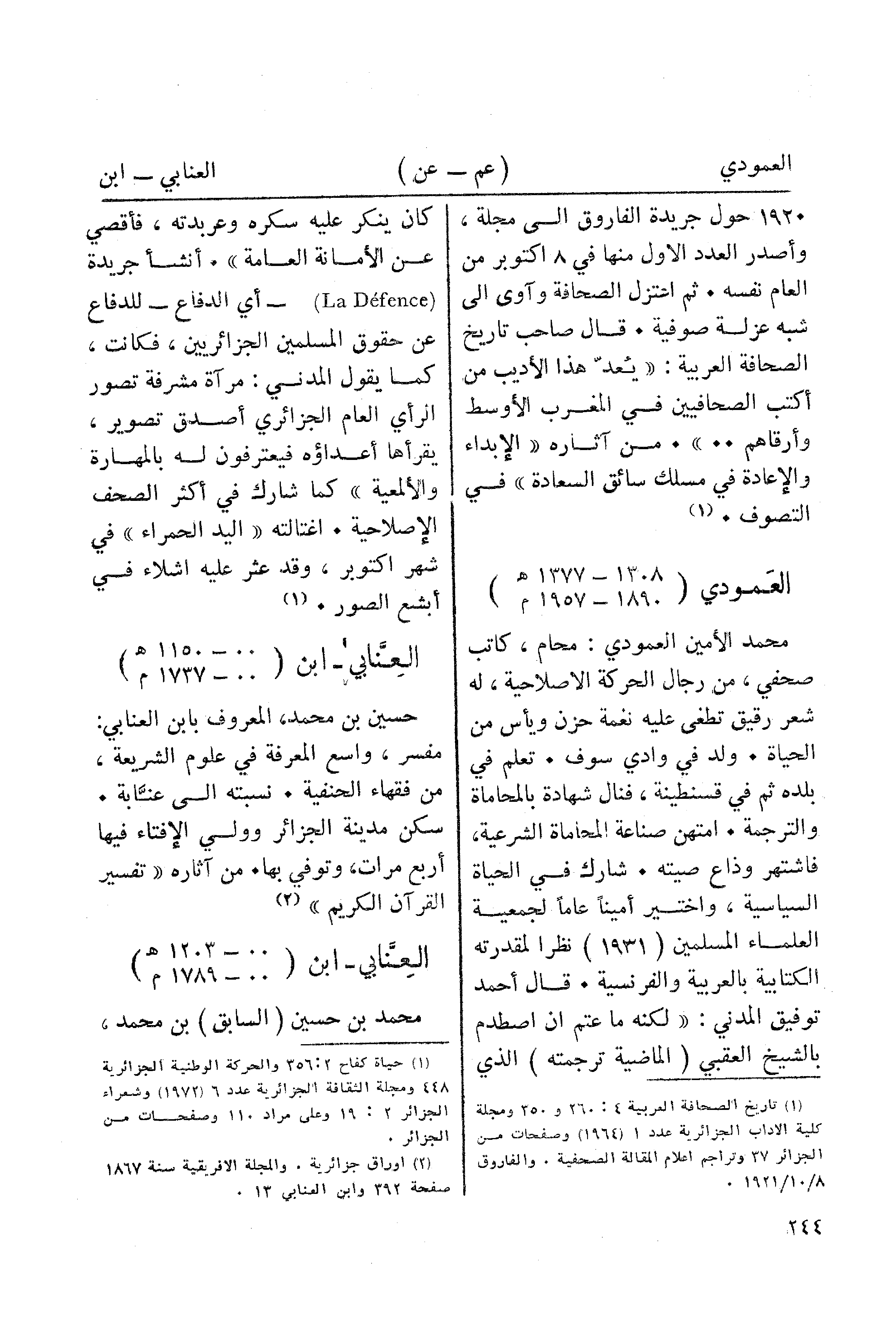 (¬1) تاريخ الصحافة العربية 4: 260 و 350 ومجلة كلية الاداب الجزائرية عدد 1 (1964) وصفحات من الجزائر 37 وتراجم اعلام المقالة الصحفية. والفاروق 8/ 10/ 1921.