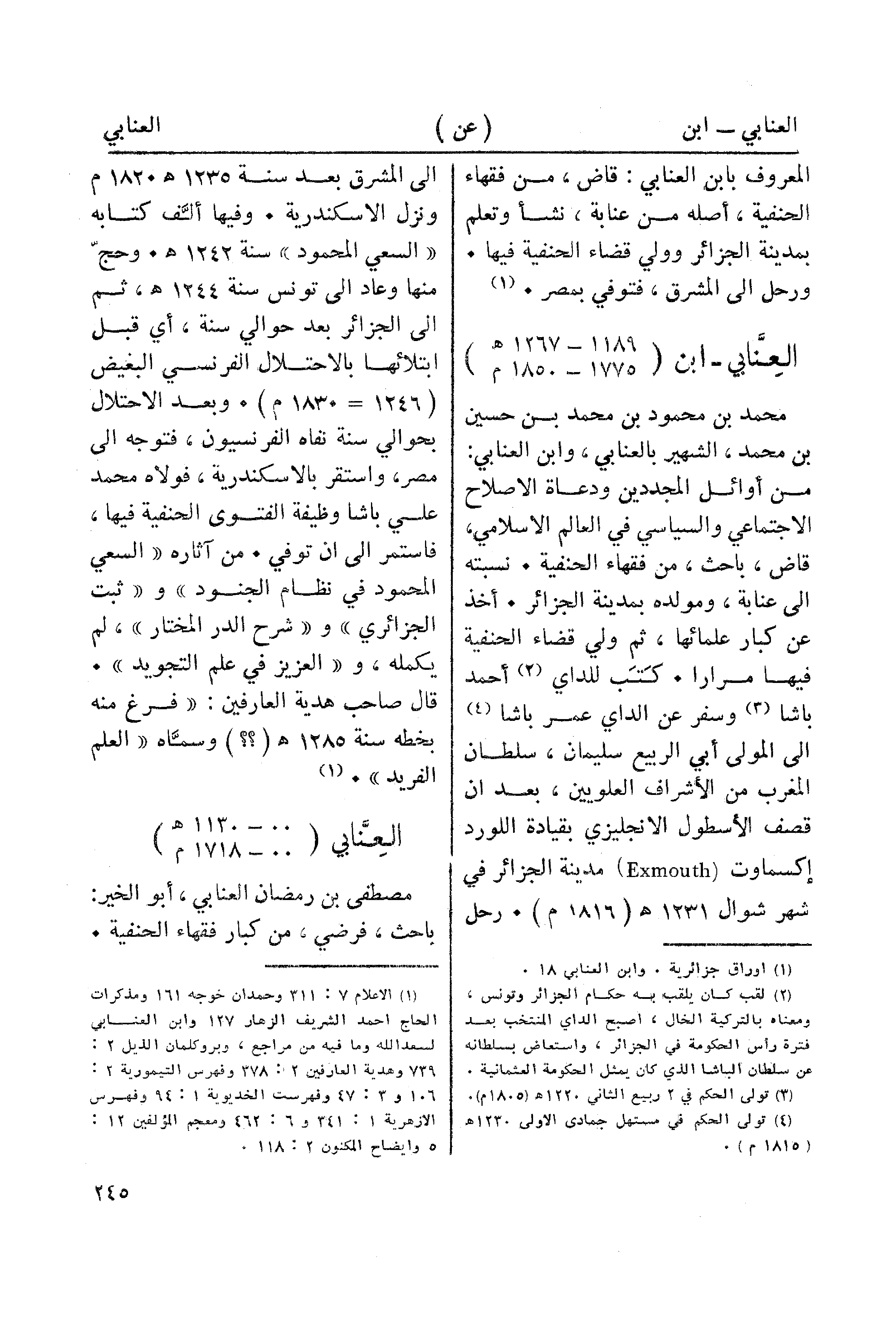 (¬1) الاعلام 7: 311 وحمدان خوجه 161 ومذكرات الحاج أحمد الشريف الزهار 127 وابن العنابي لسعد الله وما فيه من مراجع، بروكلمان الذيل 2: 739 وهدية العارفين 2/: 378 وفهرس التيمورية 2: 106 و 3: 47 وفهرست الخديوية 1: 94 وفهرس الأزهرية 1: 341 و6: 462 ومعجم المؤلفين 12: 5 وإيضاح المكنون 2: 118.