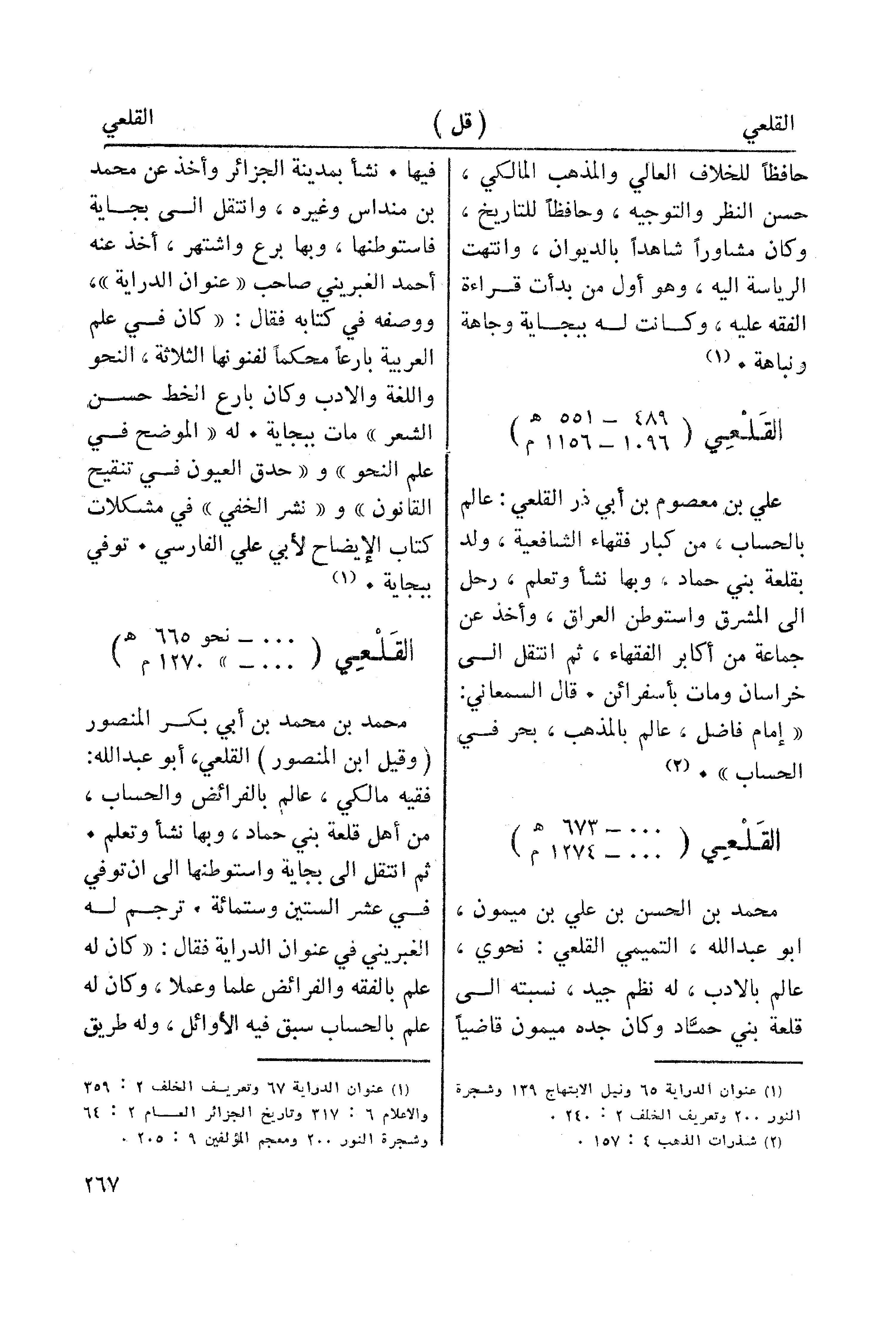 علي بن معصوم بن أبي ذر القلعي: عالم بالحساب، من كبار فقهاء الشافعية، ولد بقلعة بني حماد. وبها نشأ وتعلم، رحل الى المشرق واستوطن العراق، وأخذ عن جماعة من أكابر الفقهاء، ثم انتقل الى خراسان ومات بأسفرائن. قال السمعاني: " إمام فاضل، عالم بالمذهب، بحر في الحساب". (¬2)
