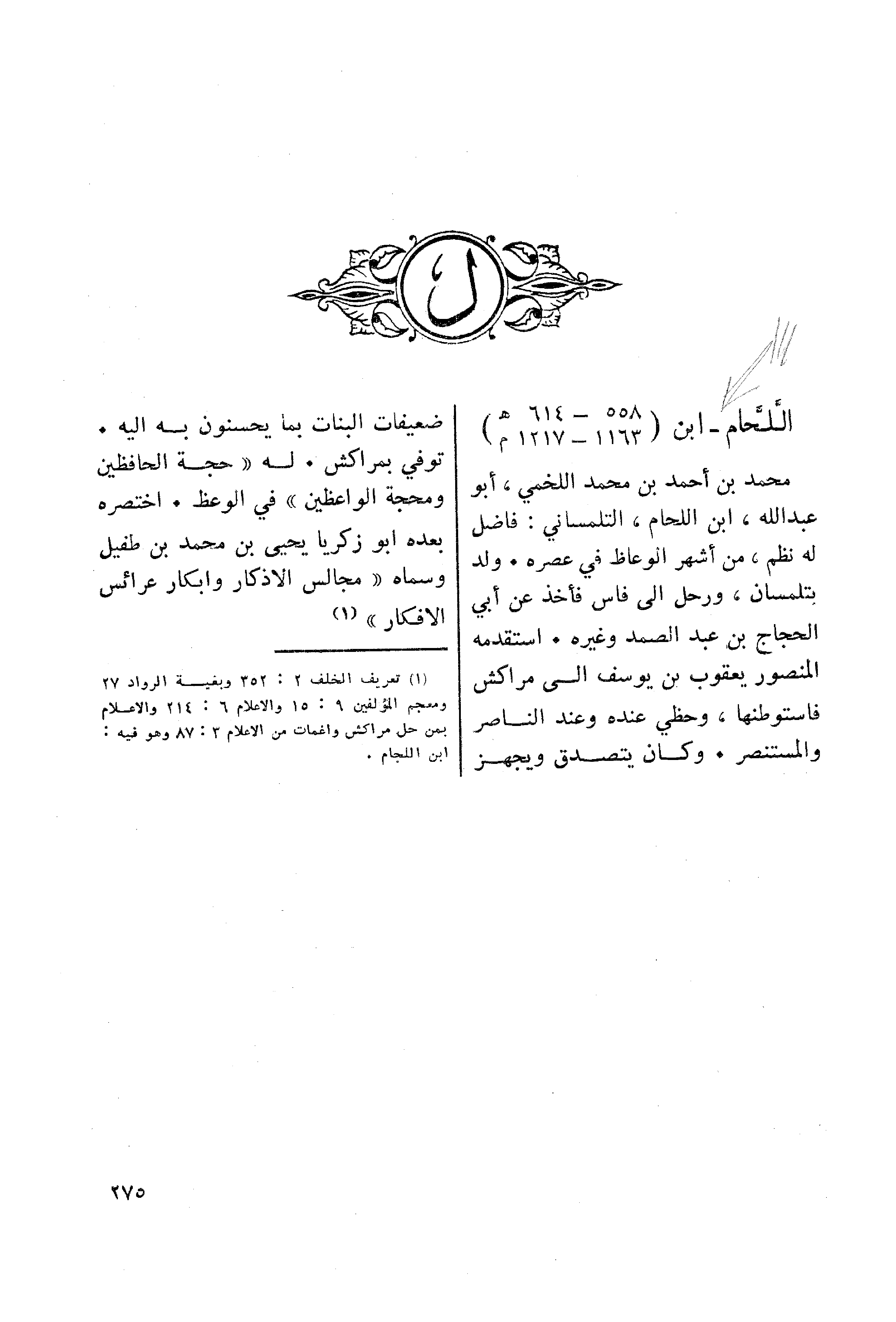 (¬1) تعريف الخلف2: 352 وبغية الرواد 27 ومعجم المولفين 6: 15 والاعلام 6: 214 والاعلام بمن حل مراكش واغمات من الاعلام 3: 87 وهو فيه. ابن اللجام.