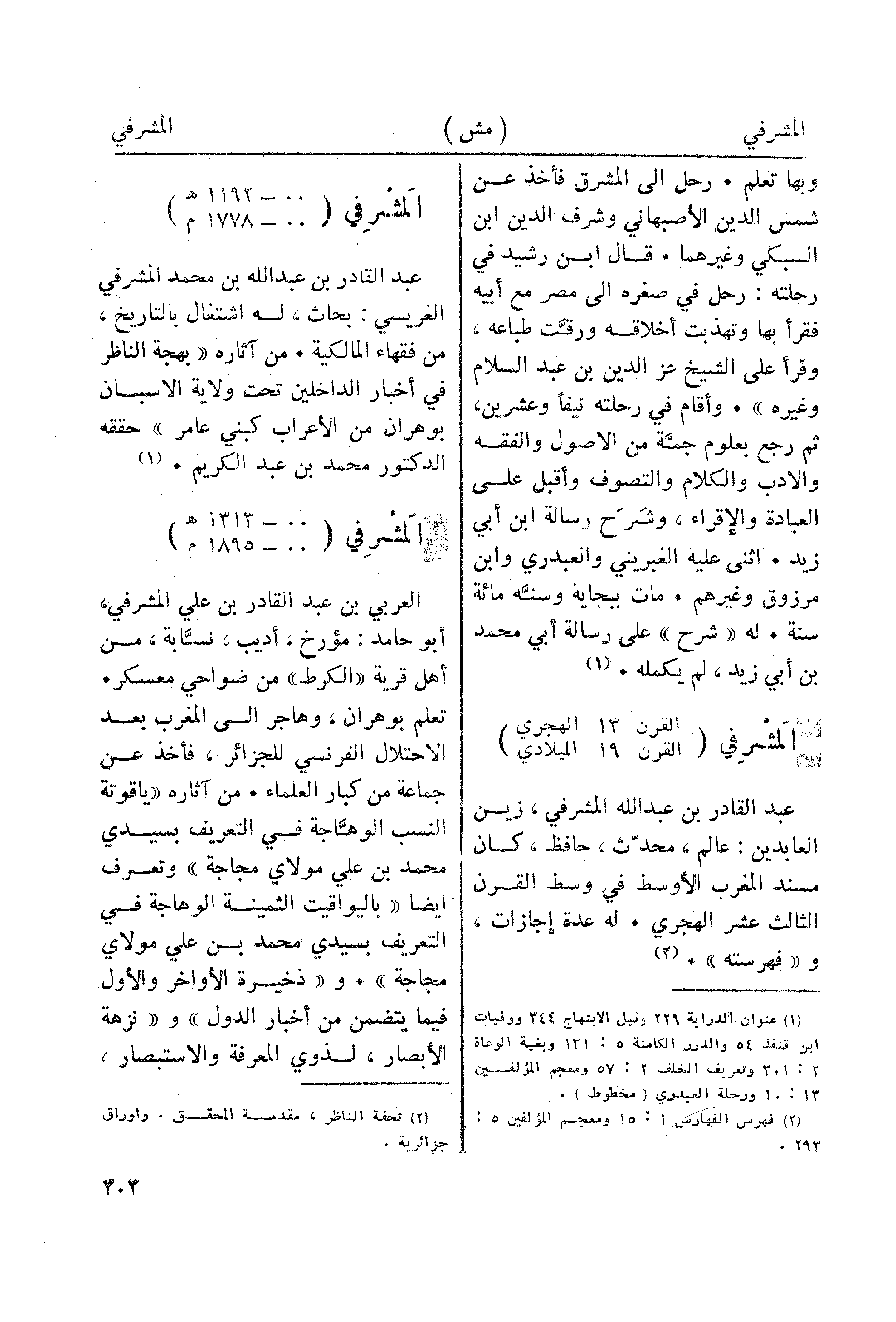 عبد القادر بن عبد الله بن محمد المشرفي الغريسي: بحاث، له اشتغال بالتاريخ، من فقهاء المالكية. من آثاره "بهجة الناظر في أخبار الداخلين تحت ولاية الاسبان بوهران من الأعراب كبني عامر" حققه الدكتور محمد بن عبد الكريم. (¬1)