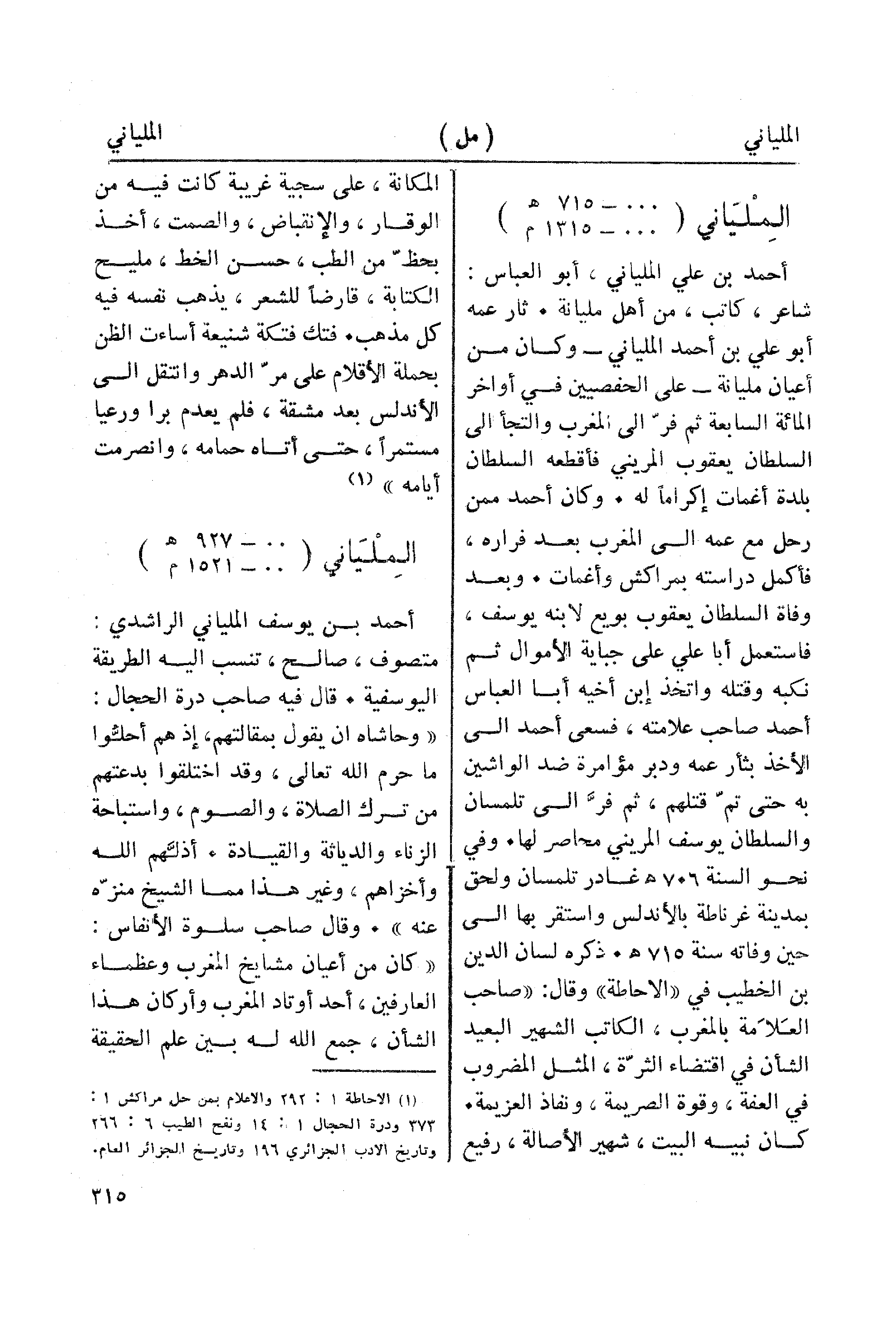 أحمد بن علي الملياني، أبو العباس: شاعر، كاتب، من أهل مليانة. ثار عمه أبو علي بن أحمد الملياني- وكان من أعيان مليانة- على الحفصيين في أواخر المائة السابعة ثم فر إلى المغرب والتجأ الى السلطان يعقوب المريني فأقطعه السلطان بلدة أغمات إكراما له. وكان أحمد ممن رحل مع عمه إلى المغرب بعد فراره، فأكمل دراسته بمراكش وأغمات. وبعد وفاة السلطان يعقوب بويع لابنه يوسف، فاستعمله أبا علي على جباية الأموال ثم نكبه وقتله واتخذ إبن أخيه أبا العباس أحمد صاحب علامته، فسعى أحمد الى الأخذ بثأر عمه ودبر مؤامرة ضد الواشين به حتى تم قتلهم، ثم فر الى تلمسان والسلطان يوسف المريني محاصر لها. وفي نحو السنة 706هـ غادر تلمسان ولحق بمدينة غرناطة بالأندلس واستقر بها الى حين وفاته سنة 715هـ. ذكره لسان الدين بن الخطيب في "الاحاطة" وقال: "صاحب العلامة بالمغرب، الكاتب الشهير البعيد الشأن في اقتضاء الثرة، المثل المضروب في العفة، وقوة الصريمة، ونفاذ العزيمة. كان نبيه البيت، شهير الأصالة، رفيع