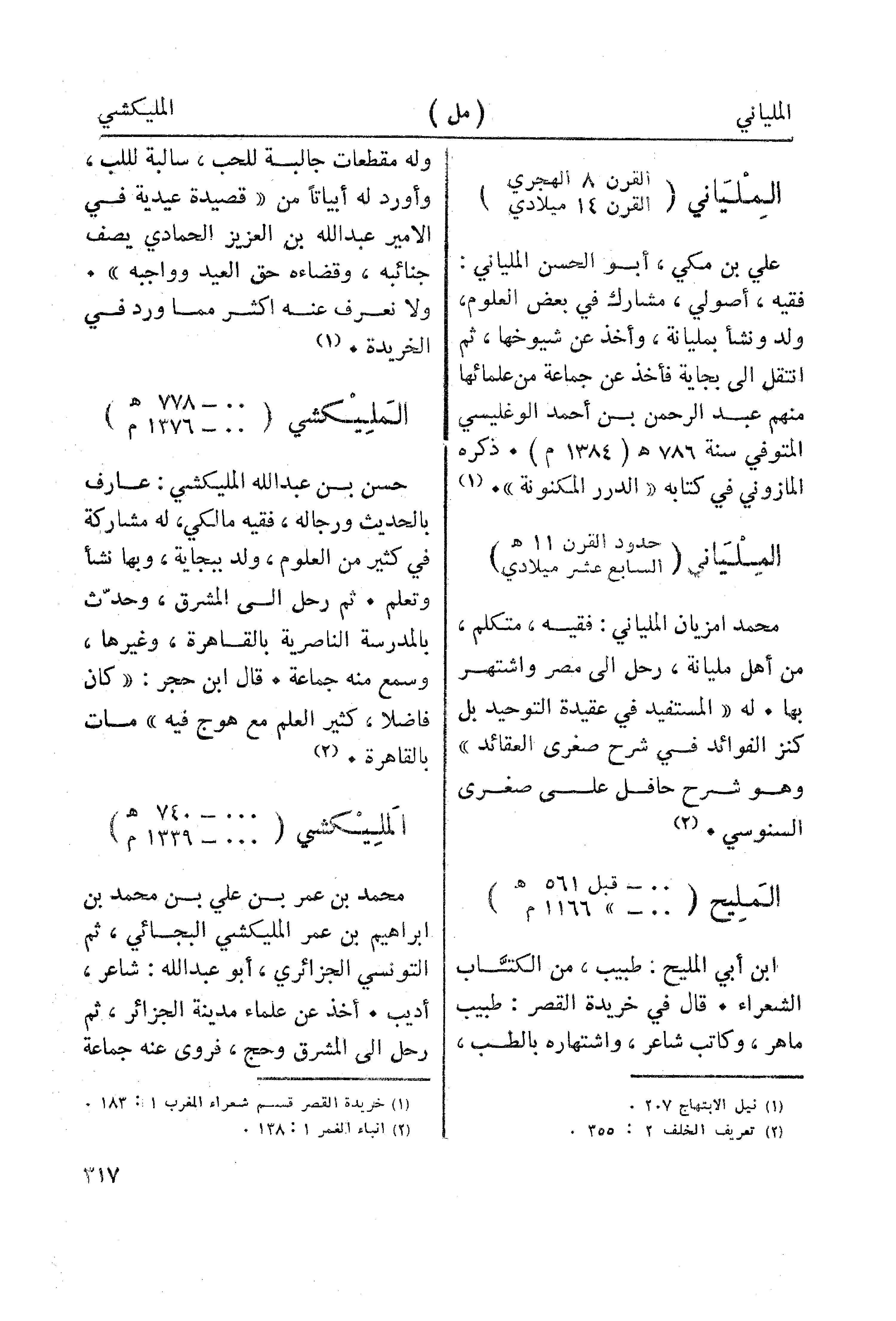 علي بن مكي، أبو الحسن الملياني: فقيه، أصولي، مشارك في بعض العلوم، ولد ونشأ بمليانة، وأخذ عن شيوخها، ثم انتقل الى بجاية فأخذ عن جماعة من علمائها منهم عبد الرحمن بن أحمد الوغليسي المتوفي سنة 786هـ (1384م). ذكره المازوني في كتابه "الدرر المكنونة". (¬1)
