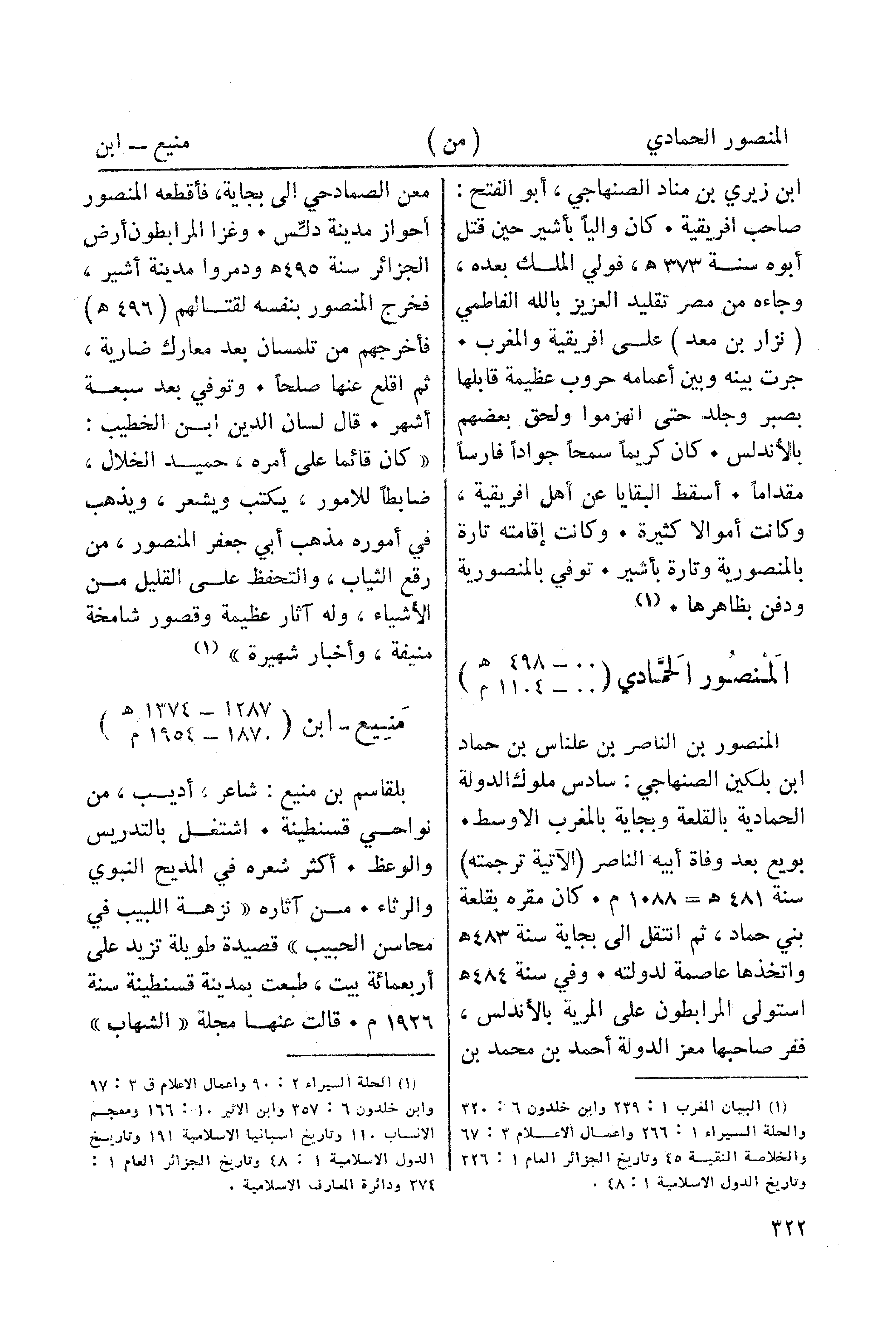 المنصور بن الناصر بن علناس بن حماد ابن بلكين الصنهاجي: سادس ملوك الدولة الحمادية بالقلعة وبجاية بالمغرب الاوسط. بويع بعد وفاة أبيه الناصر (الآتية ترجمته) سنة 481هـ= 1088م. كان مقره بقلعة بني حماد، ثم انتقل الى بجاية سنة 483هـ واتحذها عاصمة لدولته. وفي سنة 484هـ استولى المرابطون على المرية بالأندلس، ففر صاحبها معز الدولة أحمد بن محمد بن