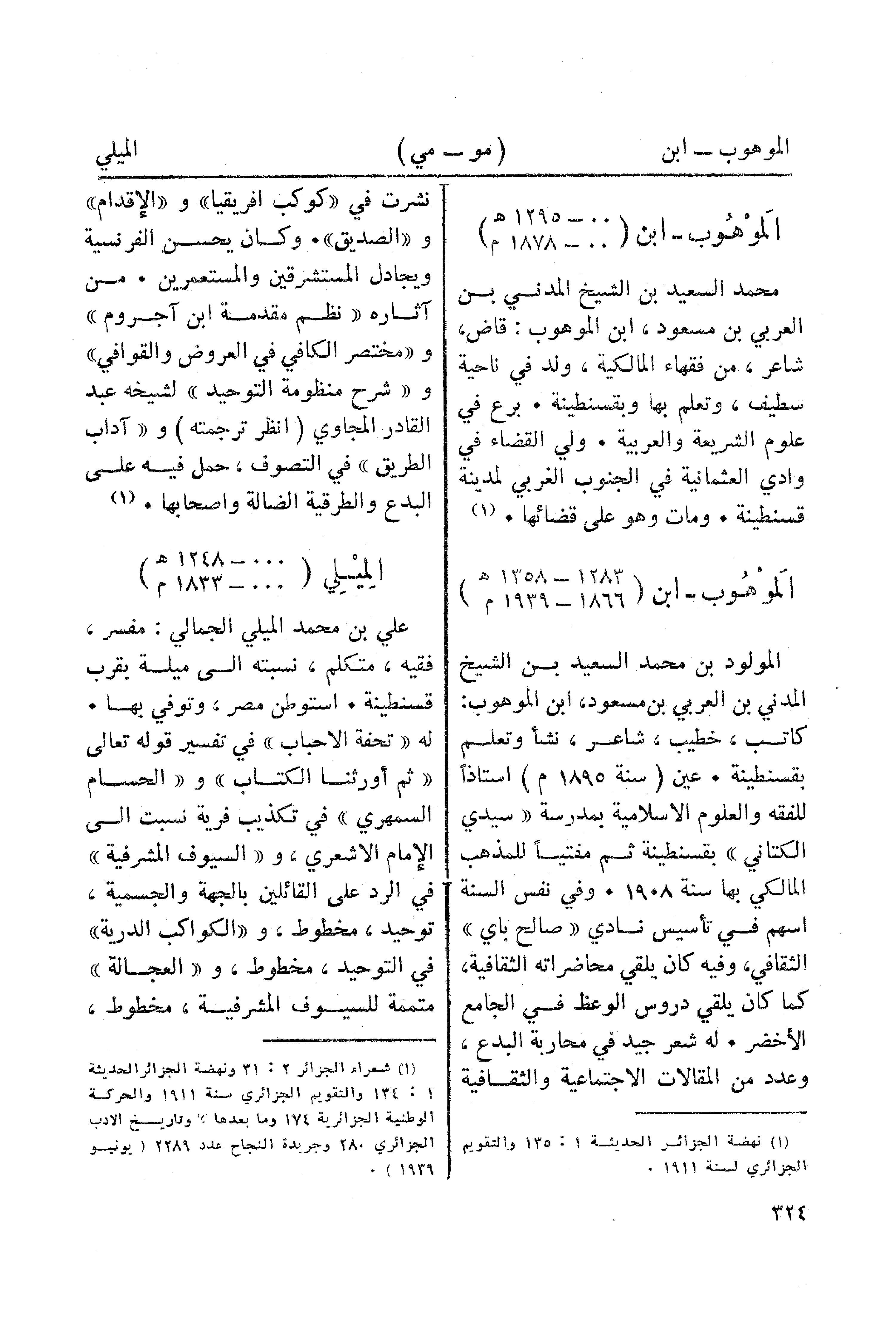 المولود بن محمد السعيد بن الشيخ المدني بن العربي بن مسعود، ابن الموهوب: كاتب، خطيب، شاعر، نشأ وتعلم بقسنطينة. عين (سنة 1895م) استاذا للفقه والعلوم الاسلامية بمدرسة "سيدي الكتاني" بقسنطينة ثم مفتيا للمذهب المالكي بها سنة 1908. وفي نفس السنة اسهم في تأسيس نادي "صالح باي" الثقافي، وفيه كان يلقي محاضراته الثقافية، كما كان يلقي دروس الوعظ في الجامع الأخضر. له شعر جيد في محاربة البدع، وعدد من المقالات الاجتماعية والثقافية