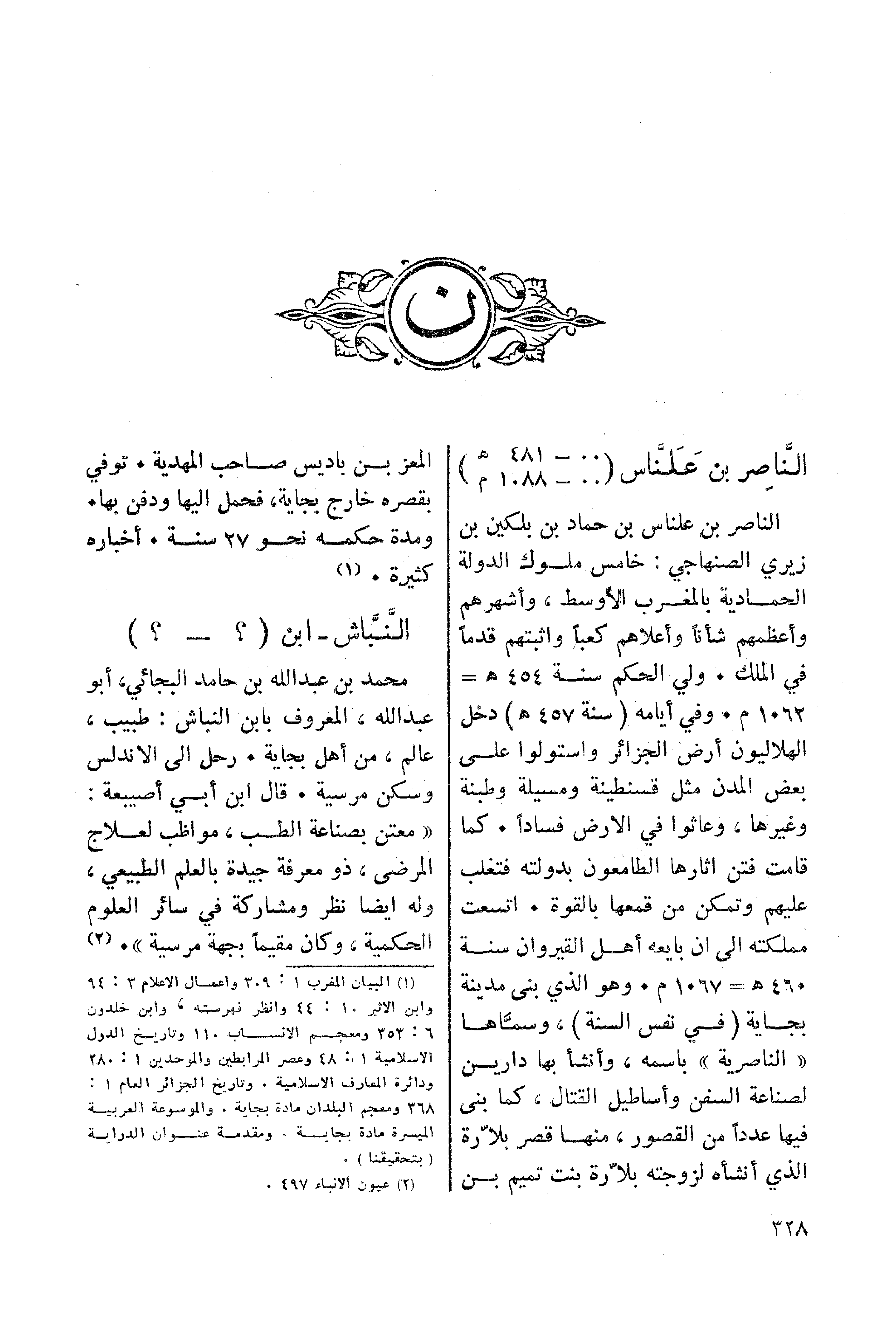 الناصر بن علناس بن حماد بن بلكين بن زيري الصنهاجي: خامس ملوك الدولة الحمادية بالمغرب الأوسط، وأشهرهم وأعظمهم شأنا وأعلاهم كعبا واثبتهم قدما في الملك. ولي الحكم سنة 454هـ= 1.62م. وفي أيامه (سنة 457 هـ) دخل الهلاليون أرض الجزائر واستولوا على بعض المدن مثل قسنطينة ومسيلة وطبنة وغيرها، وعاثوا في الارض فسادا. كما قامت فتن آثارها الطامعون بدولته فتغلب عليهم وتمكن من قمعها بالقوة. اتسعت مملكته الى ان بايعه أهل القيروان سنة 460 هـ= 1067م. وهو الذي بنى مدينة بجاية (في نفس السنة)، وسماها "الناصرية" باسمه، وأنشأ بها دارين لصناعة السفن وأساطيل القتال، كما بنى فيها عددا من القصور، منها قصر بلارة الذي أنشأه لزوجته بلارة بنت تميم بن