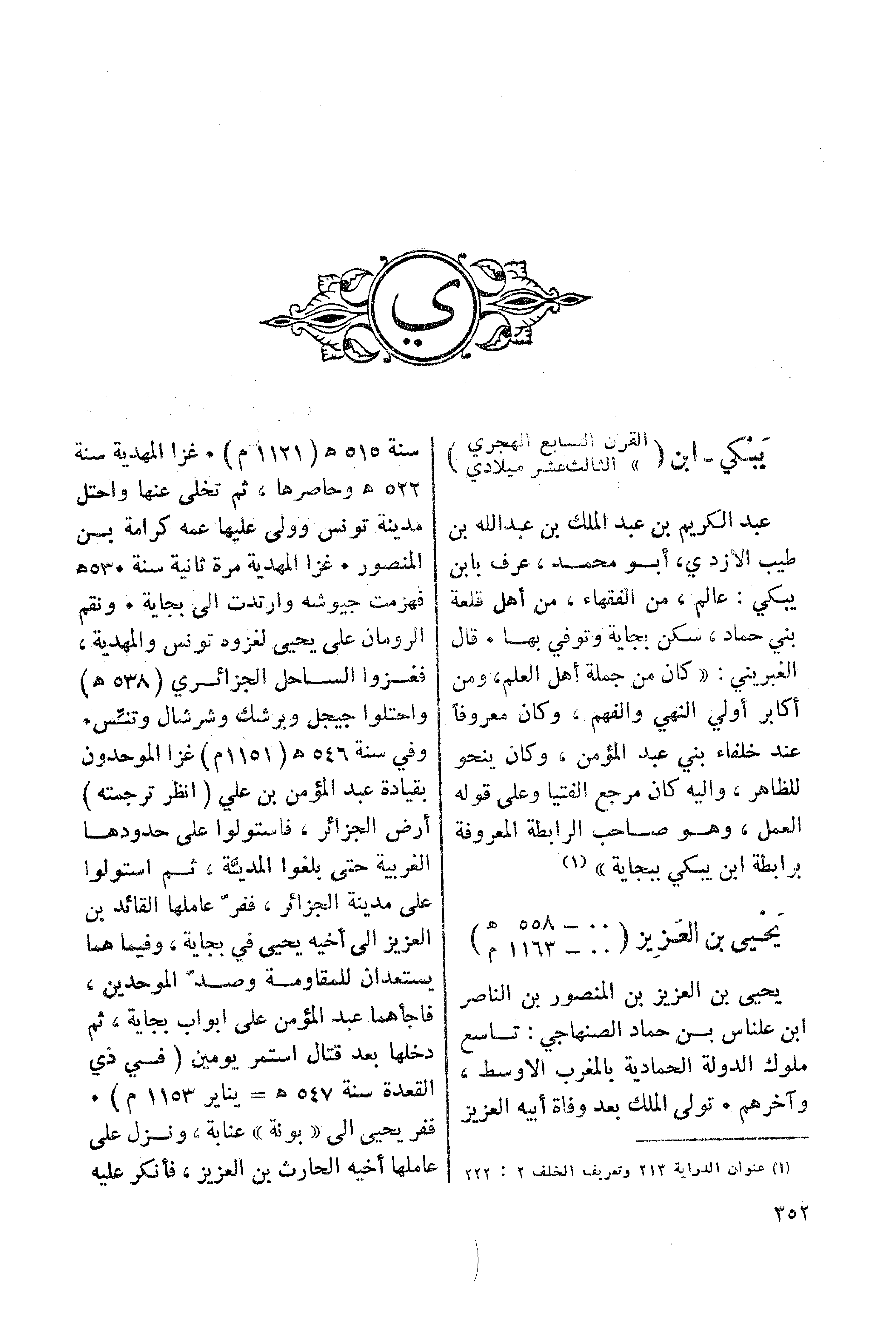 سنة 515هـ (1121م). غزا المهدية سنة 522هـ وحاصرها، ثم تخلى عنها واحتل مدينة تونس وولي عليها عمه كرامة بن المنصور. غزا المهدية مرة ثانية سنة 530هـ فهنرمت جيوشه وارتدت الى بجاية. ونقم الرومان على يحيى لغزوه تونس والمهدية، فغزوا الساحل الجزائري (538 هـ) واحتلوا جيجل وبرشك وشرشال وتنس. وفي سنة 546 هـ (1151م) غزا الموحدون بقيادة عبد المؤمن بن علي (انظر ترجمته) أرض الجزائر، فاستولوا على حدودها الغربية حتى بالغوا المدية، ثم استولوا على مدينة الجزائر، ففر عاملها القائد بن العزيز إلى أخيه يحيى في بجاية، وفيما هما يستعدان للمقاومة وصد الموحدين، فاجأهما عبد المؤمن على أبواب بجاية، ثم دخلها بعد قتال استمر يومين (في ذي القعدة سنة 547هـ= يناير 1153م). ففر يحيى الى " بونة " عنابة، ونزل على عاملها أخيه الحارث بن العزيز، فانكر عليه