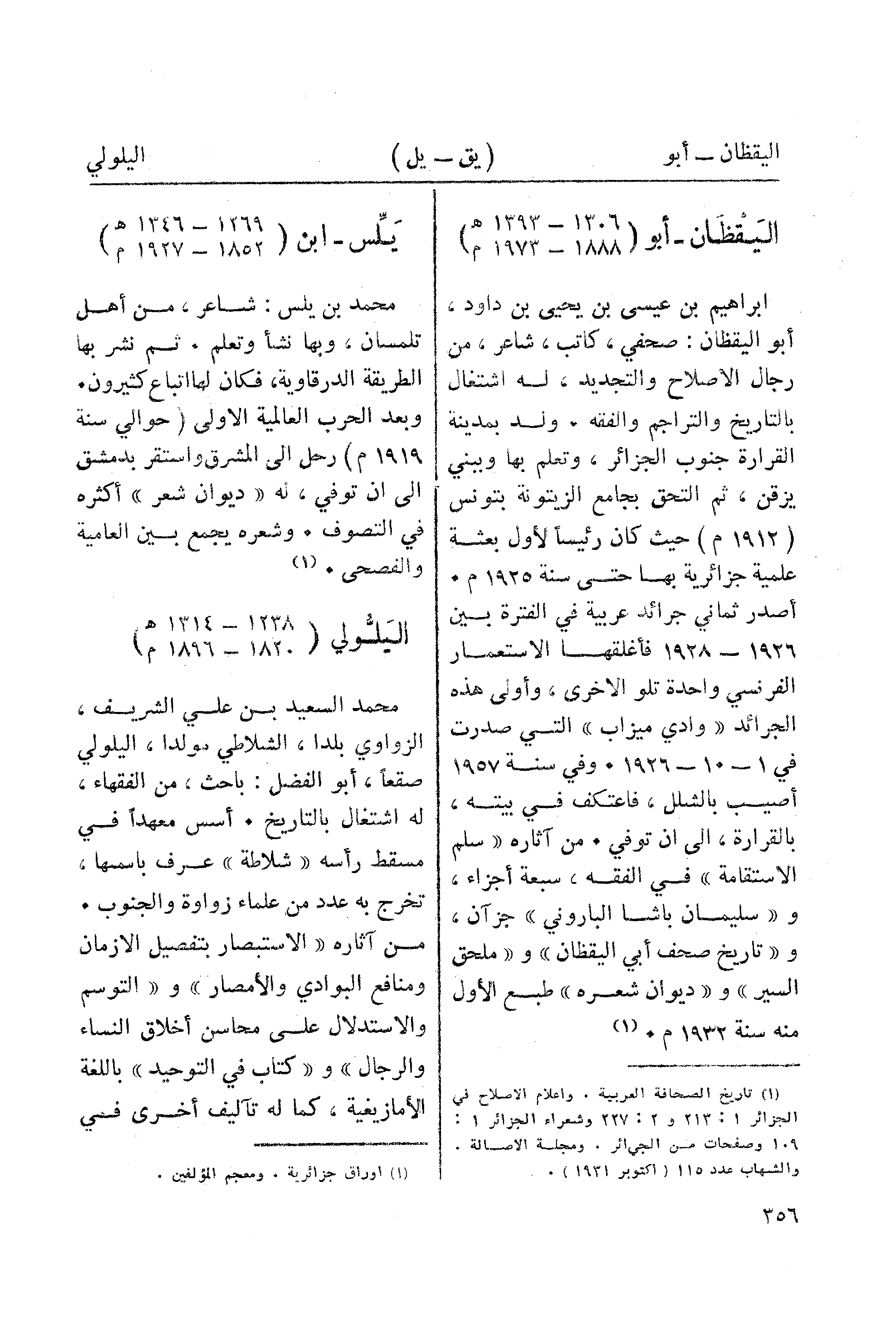 ابراهيم بن عيسى بن يحيى بن داود، أبو اليقظان: صحفي، كاتب، شاعر، من رجال الإصلاح والتجديد، له اشتغال بالتاريخ والتراجم والفقه. ولد بمدينة القرارة جنوب الجزائر، وتعلم بها وببني يزقن، ثم التحق بجامع الزيتونة بتونس (1912 م) حيث كان رئيسا لأول بعثة علمية جزائرية بها حتى سنة 1925م. أصدر ثماني جرائد عربية في الفترة بين 1926 - 1928 فأغلقها الاستعمار الفرنسي واحدة تلو الأخرى، وأولى هذه الجرائد "وادي ميزاب " التي صدرت في 1 - 10 - 1926. وفي سنة 1957 أصيب بالشلل، فاعتكف في بيته، بالقرارة، الى ان توفي. من آثاره "سلم الاستقامة " في الفقه، سبعة أجزاء، و "سليمان باشا الباروني" جزآن، و "تاريخ صحف أبي اليقظان" و"ملحق السير " و"ديوان شعره " طبع الأول منه سنة 1932م. (¬1)