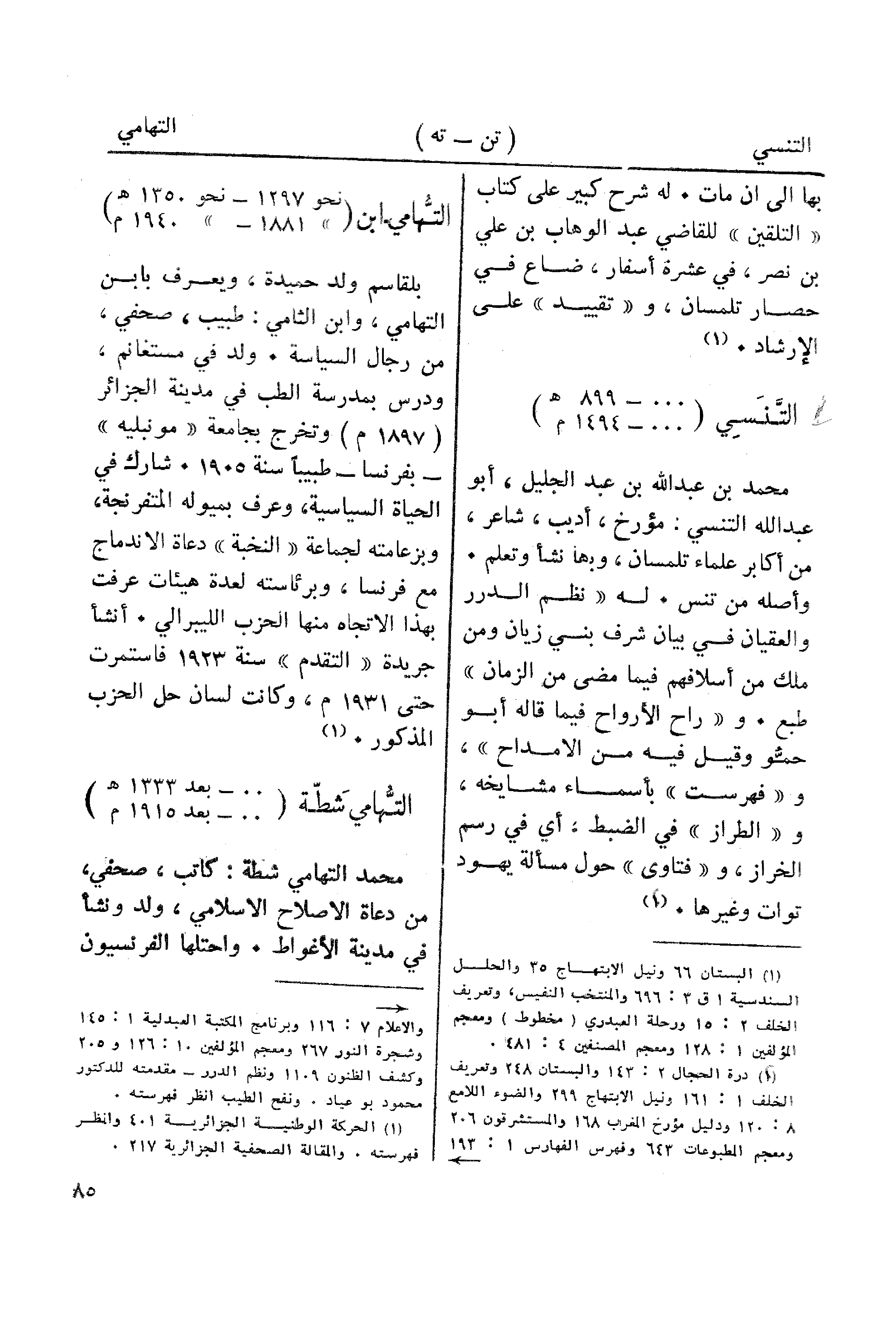 محمد بن عبد الله بن عبد الجليل، أبو عبد الله التنسي: مؤرخ، أديب، شاعر، من أكابر علماء تلمسان، ورها نشأ وتعلم. وأصله من تنس. له "نظم الدرر والعقيان في بيان شرف بني زيان ومن ملك من أسلافهم فيما مضى من الزمان" طبع. و "راح الأرواح فيما قاله أبو حمو وقيل فيه من الامداح"، و"فهرست " بأسماء مشايخه، و "الطراز" في الضبط، أي في رسم الخراز، و"فتاوى" حول مسألة يهود توات وغيرها. (¬2)