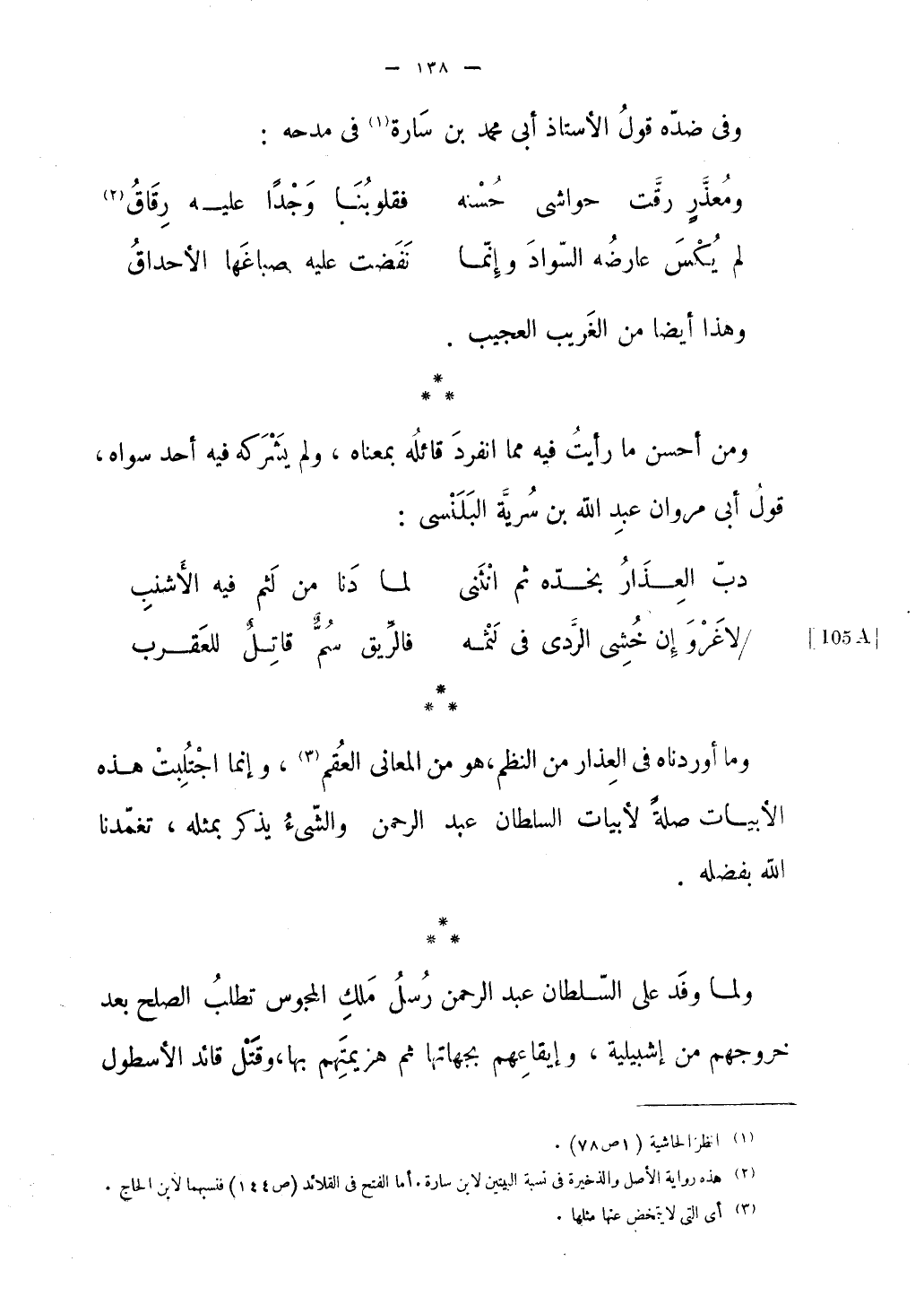 أن في العالم منظراً مثل هذا، وقد رأيت عند ملكنا نساء انتخبن له من جميع الأمم فلم أر فيهن حسناً يشبه هذا. فقالت لترجمانها: سله أمجد هو أم هازل؟ فقال: لا، بل مجد. فقالت له: فليس في بلدهم إذا جمال! فقال الغزال: فاعرضوا علي من نسائكم حتى أقيسها بها. فوجهت الملكة في نساء معلومات بالجمال فحضرن، فصعد فيهن وصوب ثم قال: فيهن جمال وليس كجمال الملكة، لأن الحسن الذي لها والصفات المناسبة ليس يميزه كل أحد، وإنما يعني به الشعراء، وإن أحبت الملكة أن أصف حسنها وحسبها وعقلها في شعر يروي في جميع بلادنا فعلت ذلك. فسرت بذلك سروراً عظيماً وزهيت، وأمرت له بصلة، فامتنع من أخذها الغزال، وقال: لا أفعل. فقالت للترجمان: سله، لم لا يقبل صلتي؟ ألأنه حقرها أم لأنه حقرني؟ فسأله، فقال الغزال: إن صلتها لجزيلة، وإن الأخذ منها لتشرف لأنها ملكة بنت ملك، ولكن كفاني من الصلة نظري إليها وإقبالها علي، فحسبي ذلك صلة. وإنما أريد أن تصلني بالوصول إليها أبداً. فلما فسر لها الترجمان كلامه زادت منه سرورا وعجبا، وقالت: تحمل صلته إليه، ومتى أحب أن يأتيني زائرا فعلا