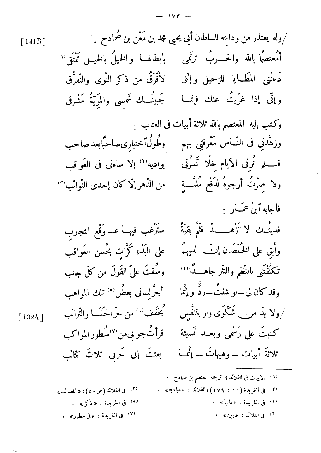 وكان الوزير ذو الوزارتين أبو الحسن المذكور ذا بضائع من العلوم والآداب كلها جواهر، وجميعها إذا أدجت الأيام زواهر؛ وكان ذكر بني عباد بالكرم بالمغرب. وقد طار وطبق الأقطار، فقصدهم بتلك البضائع التي لا يروج إلا لديهم نفاقها، ولا تقام إلا عندهم أسواقها؛ فأخفق لاشتغالهم عنه - لا لتقلص ظلال كرمهم - مسعاه، وتكدر مورده وصوح مرعاه؛ فأم غير مورد نداهم موردا، وارتحل عنهم منشدا:
