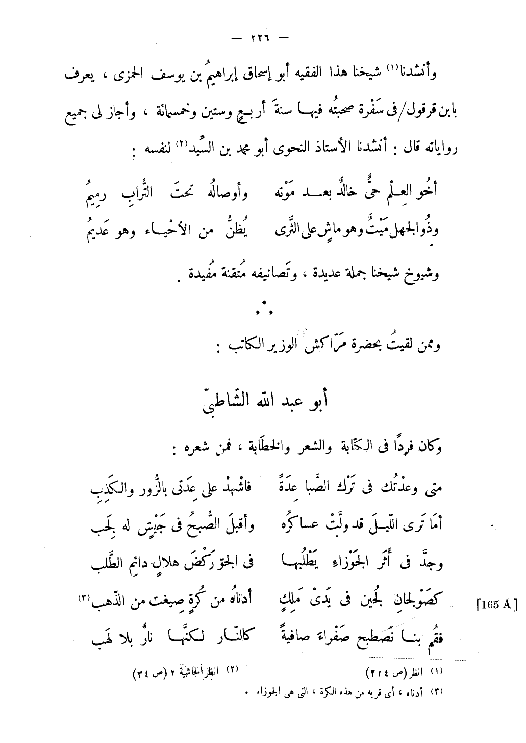 أبو زيد عبد الرحمن بن عبد الله بن احمد بن أبي الحسن، واسمه: أصبغ بن حسين بن سعدون بن رضوان بن فتوح، وهو الداخل للأندلس. هكذا أملي على نسبه، وقال: إنه من ولد أبي رويحة الخثعمي الذي عقد له رسول الله صلى الله عليه وسلم لواء عام الفتح، ذكره أهل السير. نشأ بمالقة، وبها تعرف، وفي أكنافها تصرف؛ حتى بزغت في البلاغة شمسه، ونزعت به إلى مطامح الهمم نفسه. أخبرني انه قرأ القرآن العظيم جمعاً وإفراداً على المقرئ الشهير أبي علي الحسين بن منصور بن الأحدب، رحمه الله، ثم قراه أيضا بالمقرأين: مقرأ نافع، وابن كثير، على الأستاذ المقرئ أبي الحسن علي بن عيسى المروي، نزيل مالقة. وقرأ الكتاب العزيز أيضا بالمقارئ الأربعة، وشيئا من العربية على المقرئ النحوي الزاهد الضرير أبي مروان عبد الملك بن مجير، وسمع على الإمام أبي عبد الله محمد بن معمر. وسمع كتاب الهداية لأبي العباس المهدوي على الشيخ الفقيه الأستاذ النحوي أبي عبد الله محمد بن سليمان، يعرف