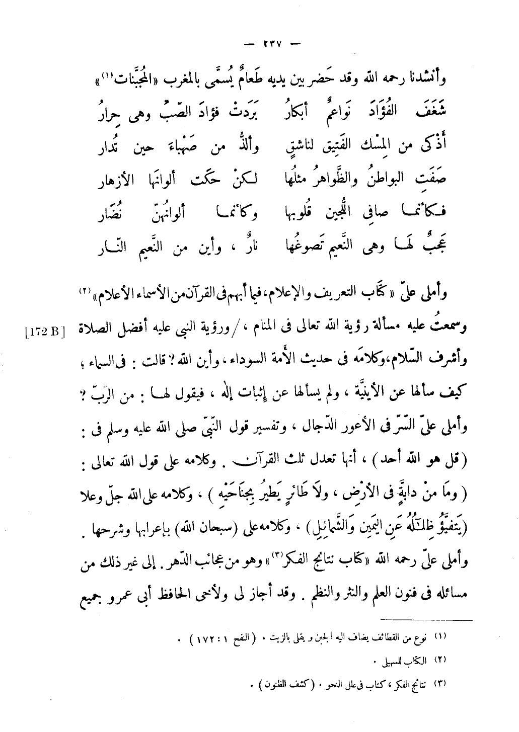 القسطلي الفائقة بقلائد الولائد أراجيوه وقصائده. ومن جرى مجراهم من المجيدين في الجد والهزل، ورقيق النظم الجزل؛ كصاحبنا الوزير أبي القاسم بن البراق، المعدود في الشعراء السباق؛ مررت على بلده ومقره، فخرج إلى متلقياً مع أهل مصره؛ وقد داسته حوادث الأيام دوسا، وغادرت صعدة قوامه قوسا وهو يسلك مسالك أهل الصبا، ويميل به الأدب طوراً إلى الجنوب وآونة مع الصبا؛ فعاتبته على بذل نفسه في طاعة الهوى جهد الاستطاعة، مع ما أعطاه الله من المعرفة والآداب ونفائس البضاعة؛ فقال لي: إنه كان وبرد شبابه قشيب، وغضن اعتداله رطيب؛ بقميص النُّسك متقمص، وبعلم الحديث متخصص؛ واجتاز يوماً وبيده مجلد من