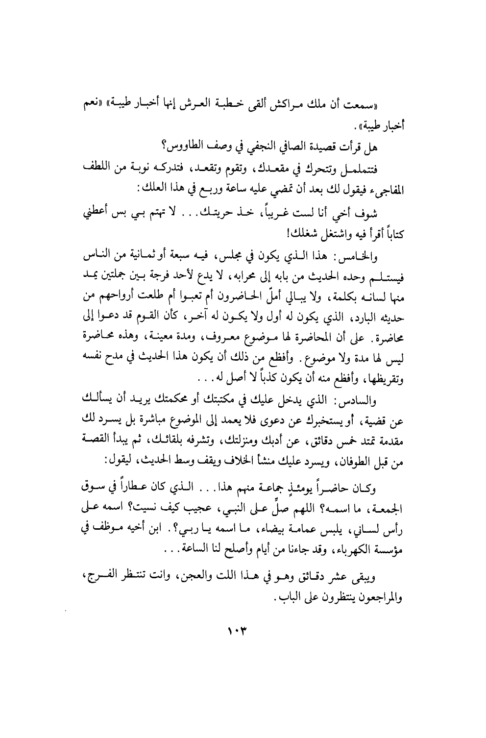 فمتى يجيء اليوم الذي نتكلم فيه كلام الشرف، ونعد وعد الصدق، وتقوم حياتنا فيه على التواصي بالحق؟ لا يعد فيه المرشح وعداً إلا وفى به بعد أن يبلغ مقاعد البرلمان، ولا يقول الموظف لصاحب الحاجة: "إني سأقضيها لك" إلا إذا كان عازماً على قضائها، ولا الصانع بإنجاز العمل إلا إذا كان قادراً على إنجازه، والموظفون يأتون من أول وقت الدوام ويذهبون من آخره، والأطباء لا يفارقون المكان ساعات العيادة، والخياط لا يتعهد بخياطة عشرة أثواب إن كان لا يستطيع أن يخيط إلا تسعاً، وتمحى من قاموسنا هذه الأكاذيب. تقول لأجير الحلاق: "أين معلمك؟ "، فيقول: "إنه هنا، سيحضر بعد دقيقة". ويكون نائماً في الدار لا يحضر إلا بعد ساعتين. ويقول لك الموظف: "من فضلك لحظة واحدة"، فتصير لحظته ساعة!