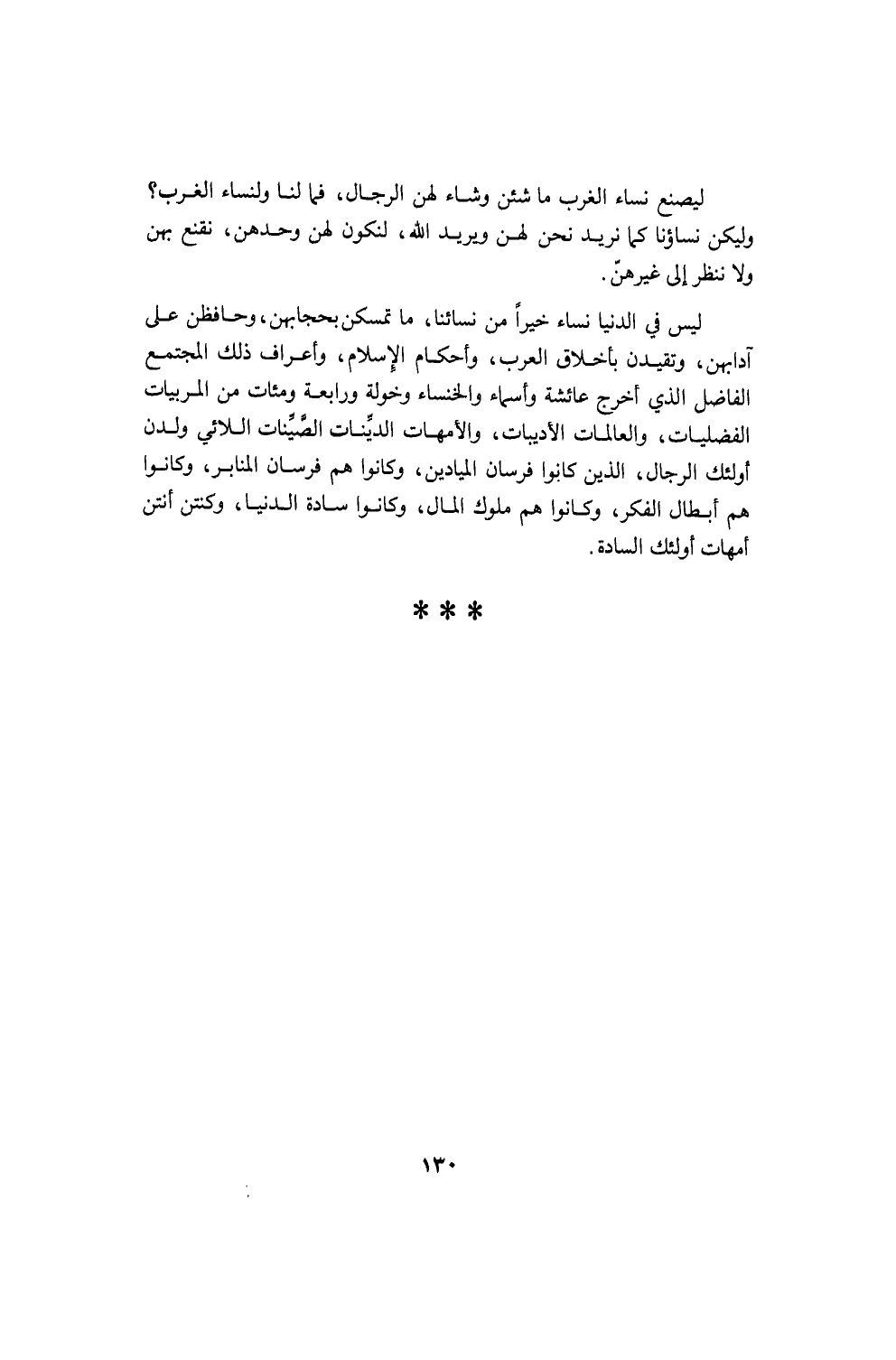 قال: نعم؛ ولو كنتم قد سمعتم مني ما عجزتم. إنّي آتيهم من الباب الذي لا يستطيع أن يراه أحد مفتوحاً إلاّ ولجه، إني أحاربهم بغرائزهم فأجعلهم يهدمون بيوتهم بأيديهم، وأثير عليهم نساءهم وأثيرهم على نسائهم، وألقي الضعف والخُلف فيهم، فأفسد عليهم رجولتهم وأخرّب أُسَرَهم، وأجعل رجالهم أخشاباً قد شغلت كل خشبة بهواها ولذتها ... إني آتيهم من باب «الغريزة الجنسية» الذي لم تدخل منه أمة إلاّ دخلت جهنم التي تحرقها، ولا تخرج منها -من بعدُ- أبداً.