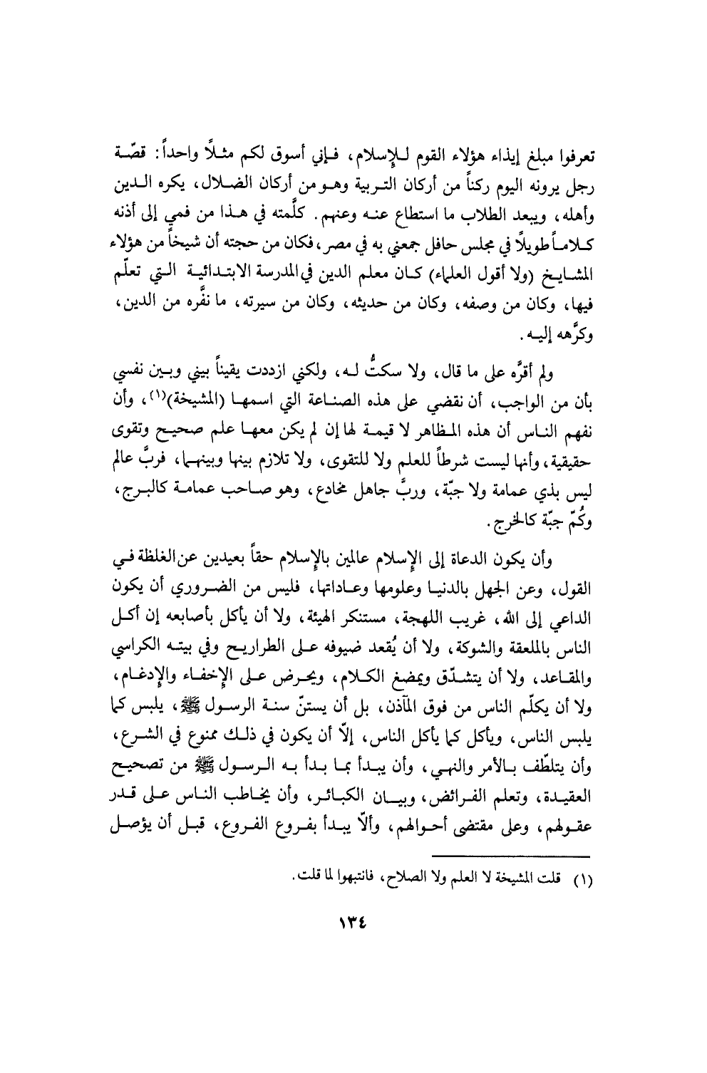 يا أيها الناس: لقد جلت جيوش العدو عن أرضكم فأَجْلوا عن بيوتكم عاداتهم، وعن رؤوسكم شُبُهاتهم، وعن مدارسكم مناهجَهم، وعن شوارعكم حاناتهم ومراقصهم، وعن محاكمكم قوانينَهم، وعن أجسام بناتكم وأولادكم ثيابَهم الكاشفة الفاضحة وأزياءهم.