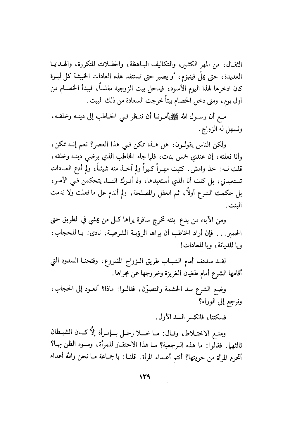 والخامس: هذا الذي يكون في مجلس فيه سبعة أو ثمانية من الناس فيستلم وحده الحديث من بابه إلى محرابه، لا يدع لأحد فرجة بين جملتين يمد منها لسانه بكلمة ولا يبالي أملَّ الحاضرون أم تعبوا أم طلعت أرواحهم من حديثه البارد الذي يكون له أول ولا يكون له آخر، كأن القوم قد دُعوا إلى محاضرة. على أن المحاضرة لها موضوع معروف ومدة معينة، وهذه محاضرة ليس لها مدة ولا موضوع. وأفظع من ذلك أن يكون هذا الحديث في مدح نفسه وتقريظها، وأفظع منه أن يكون كذباً لا أصل له!