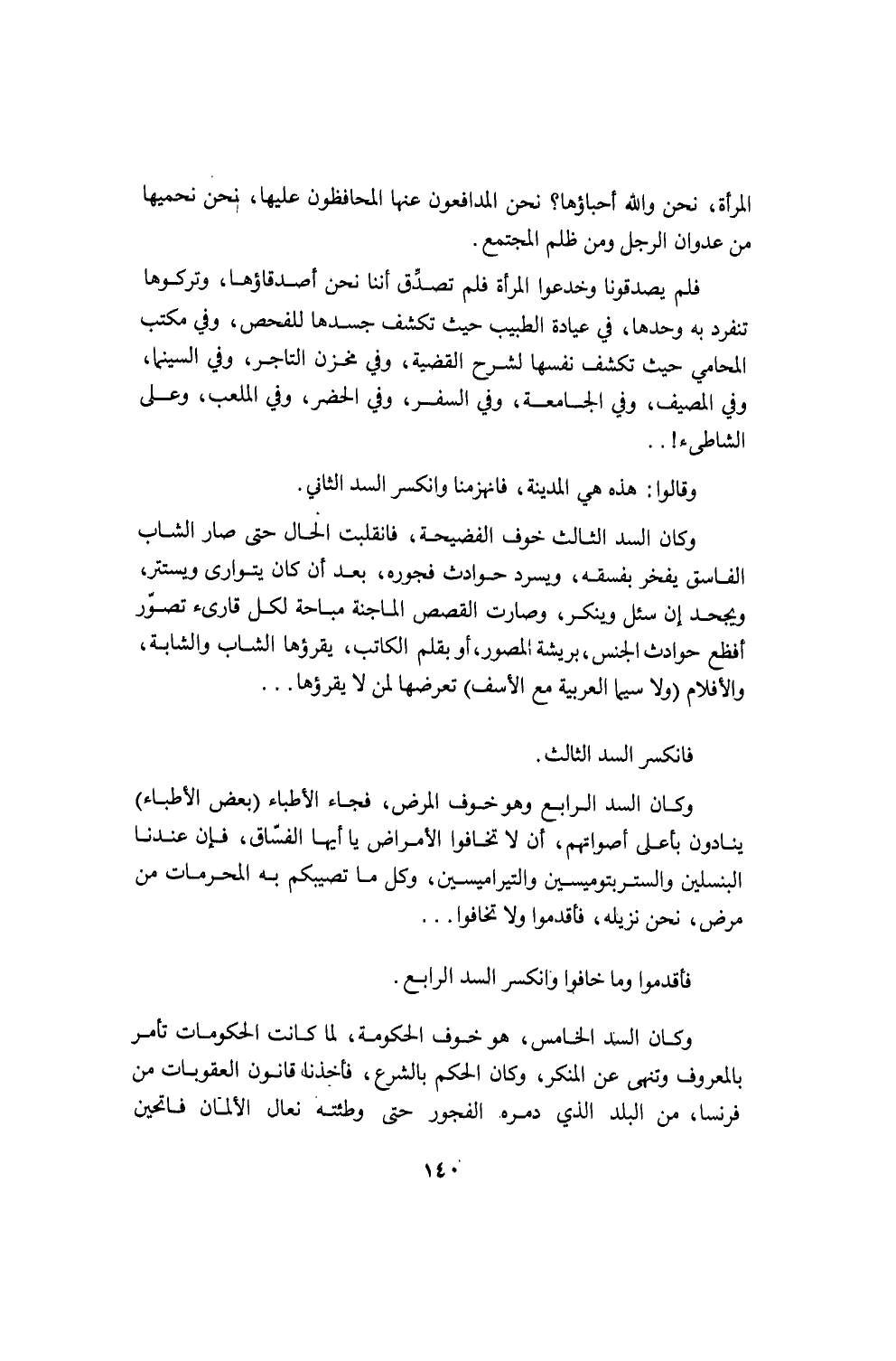 والثامن: المرأة النظيفة المدبّرة ربّة البيت المثالية، التي لا يخطر على بالها تنظيف السجاد وجمع ست بنات لضربها بالعصي إلاّ على السطح قبل أن تطلع الشمس، فلا تحس وأنت نائم بعد الصلاة إلاّ ست عصي قد نزلت خَبْطاً على رأسك في أوركسترا همجية وحشية توقظ الأموات فضلاً عن النائمين. ومثلها الرجل النظيف المهذَّب الذي لا يستطيع أن يتحمل الوسخ في فمه ولا في أذنه، ولا أن ينتظر حتى ينفرد بنفسه، فلا تزال إصبعه تدور في أنفه وفي أذنه وهو في المجلس الحافل، ينكش أسنانه بعوده، وربما فعل أشنع من ذلك فنكشها بظفره ثم مسحه بالمقعد، أو أخذ جريدة أو ورقة وطواها ونظّف أسنانه بطرفها!