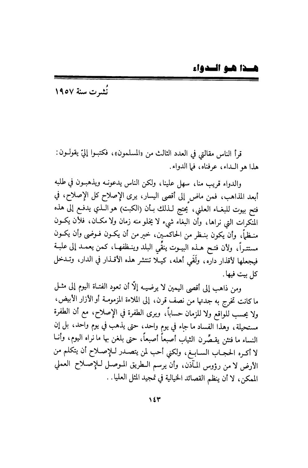 إن الإنسان لا يعرف قيمة النعم إلاّ إذا فقدها. ولقد عرفت الآن ما قيمة حياة الأسرة؛ إن قعدة بلدية على «طرّاحتي» وأولادي أمامي وكتابي في يدي أمتع من كل ما في الدنيا من فنادق.