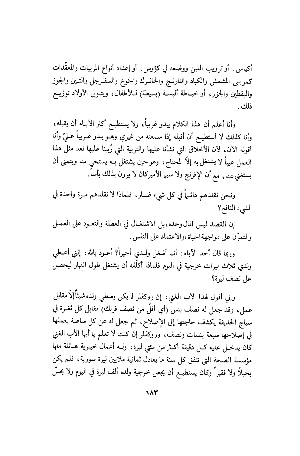 ويقول إن سبب ذلك كله المدرسة أولاً، والجامعة ثانياً، ويلعن المدارس التي علمت البنات الاختلاط والقعود إلى جنب الرجال، ومبادلتهم الأحاديث، وما يجر إليه الحديث من أضرار، ويلعن المجتمع الذي أفسدهن ... إلى آخر ما جاء في الكتاب.