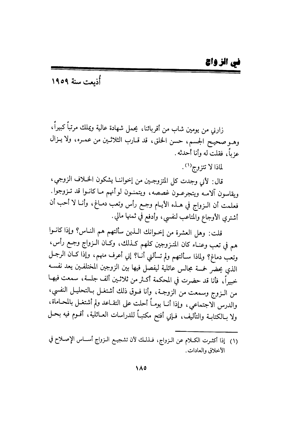 قلنا للشابة: الزواج ممنوع لأن الشباب شُغلوا عنه بالحرام، ولأن الآباء طمعوا بمهور النساء وجعلوا بناتهم تجارة للربح لا باباً للحياة الشريفة العفيفة، ورددنا الخاطب التقي الصالح، وأطلقنا البنت تخرج بادية محاسنها ظاهرة مفاتنها، قد نبذت حجابها وأبدت سحرها وشبابها.