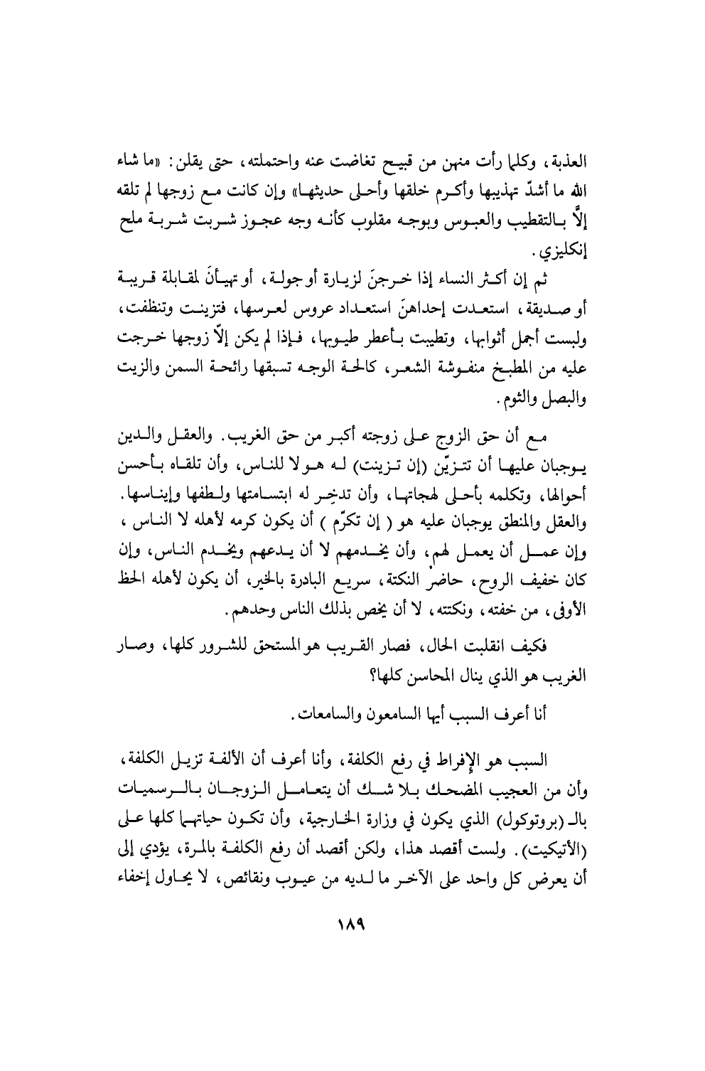 حتى ظنت هذا الاختلاط مدنية، وتركوها تنفرد بالرجل وحدها: في عيادة الطبيب حيث تكشف عن بعض جسدها، وفي مخزن التاجر حيث تكلمه ويكلمها وتحسر عن وجهها لترى البضاعة وعن يدها لتمسك بها، وفي المدارس التي جعلناها مختلطة، بدأنا من رياض الأطفال فقلنا: هؤلاء صغار لا يدركون. وهذا حق، ولكن ألا تبقى صورة البنت في ذاكرته حتى يكبر؟ فإذا كبر ألا يكون تذكر أيام الروضة والحديث عنها فاتحة لصلة جديدة بينه وبينها؟ أوَ ليس في رياض الأطفال بنات وصبيان بلغوا وبلغن سن التمييز وبدؤوا يدركون -من كثرة ما يسمعون من الناس وما يرون من المسلسلات والأفلام- شيئاً من معنى الزواج؟