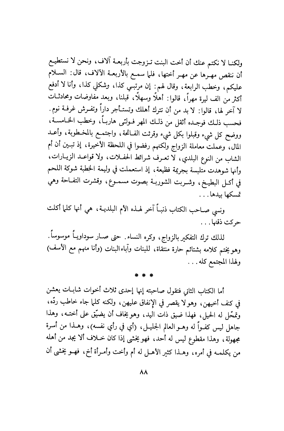 فماذا أصنع وكيف أفرّ من هؤلاء الذين يسرقون وقتي؟ آتي المحكمة منذ الصباح لأدقق في دعاوى اليوم فيدخل عليّ صديق ثقيل، لا يمنعه إغلاق الباب ولا بكور الوقت، فأحاول صرفه بالحسنى فأحادثه حتى أظن أني قد قمت بحقه وأنه قد سكت فأنصرف إلى عملي، فلا أكاد أجمع ذهني وأقبل على أوراقي حتى يفتح فمه ويلقي الجوهرة: "كيف الصحة؟ " ... "الله يحفظكم، الحمد لله. بس الشغل كثير، كل يوم نحو أربعين دعوى كما ترى، فأنا آتي باكراً لأدققها". وأقول في نفسي إنه لو كان حيواناً لفهم الآن. وأرجع لعملي مطمئناً، فلا تمضي مدة حتى يلقي جوهرة أخرى: "قضايا الطلاق كثيرة مو هيك؟ " (¬1)، فأجيب بما تيسر، ويسكت. فأعود إلى عملي، فلا أكاد أستغرق فيه حتى ينطق المحترم فيقول: "يمكن القضاء مزعج؟ "، فأنفزرُ (¬2) وأنفجر وأنسى كل آداب الاجتماع وأصرخ فيه: "بل أنت والله المزعج، مانك شايف شغل جاي تتسلى على حسابي؟! ". ويذهب يحدّث الناس بأني غليظ شرس، مغرور بالوظيفة، قليل التهذيب. ويشيع فيّ مقالة السوء.