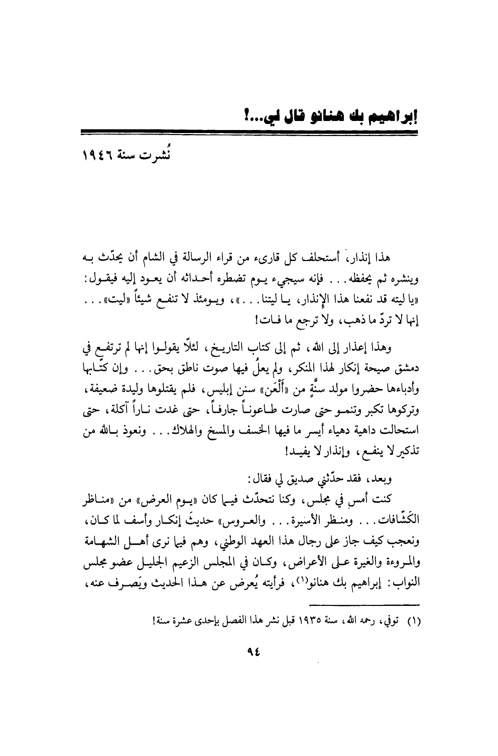 فهل يريد سيدي -أعزّه الله- أن أمحو مَلَكة الكتابة من رأسي، وأطمس نور البصيرة من قلبي، وأسدل على عيني حجاباً حتى لا أرى فأسرّ فأشكر أو أبتئس فأنقد، وأهجر الكتب حتى لا أقرأ فيفتح علي الكتاب طريقاً إلى مقالة، وأتعزّل الناس حتى لا أسمع حديثاً فأكتب عن هذا الحديث، أو قصة فأدوّن هذه القصة وأدلّ على مكان العبرة منها وموطن العظة فيها؟ فهل يريد سيدي أن أذهب إلى غار في الجبل فأحبس نفسي فيه كيلا أكتب فأزعج معاليه؟