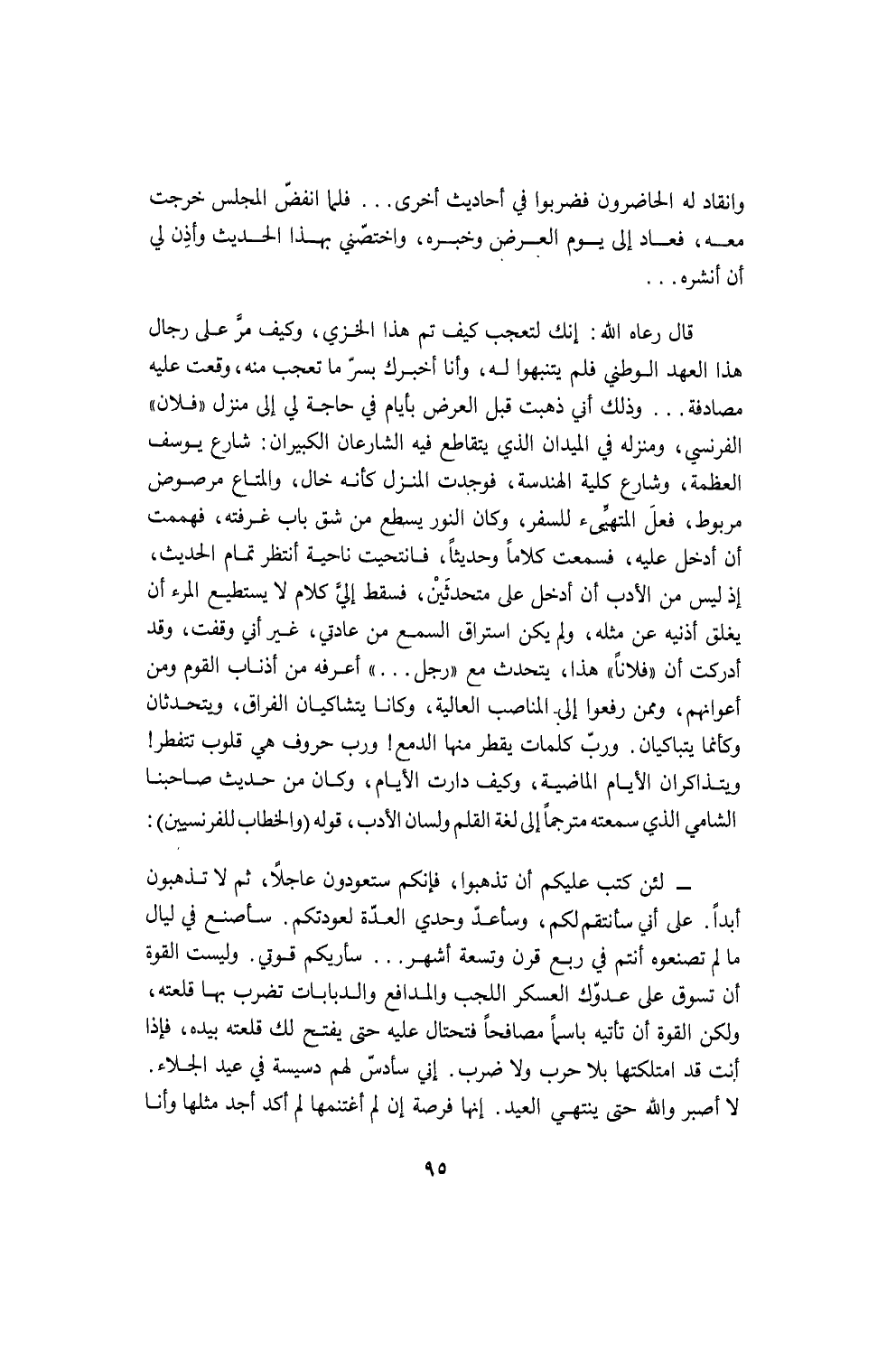 كلا! كلا يا سيدي؛ فالموظف من الأمة وإلى الأمة. وليس في البلد شعب وموظفون، ولكنّ فيه شعباً واحداً يشعر بشعور واحد، ويصدر عن مبدأ واحد ويسعى إلى غاية واحدة. ولأن تعرف أنت هذه الحقيقة فتعمل بها أولى من أن أنزل أنا عند رأيك وأخضع لإرادتك فيما يؤذي الحقيقة وينافيها.