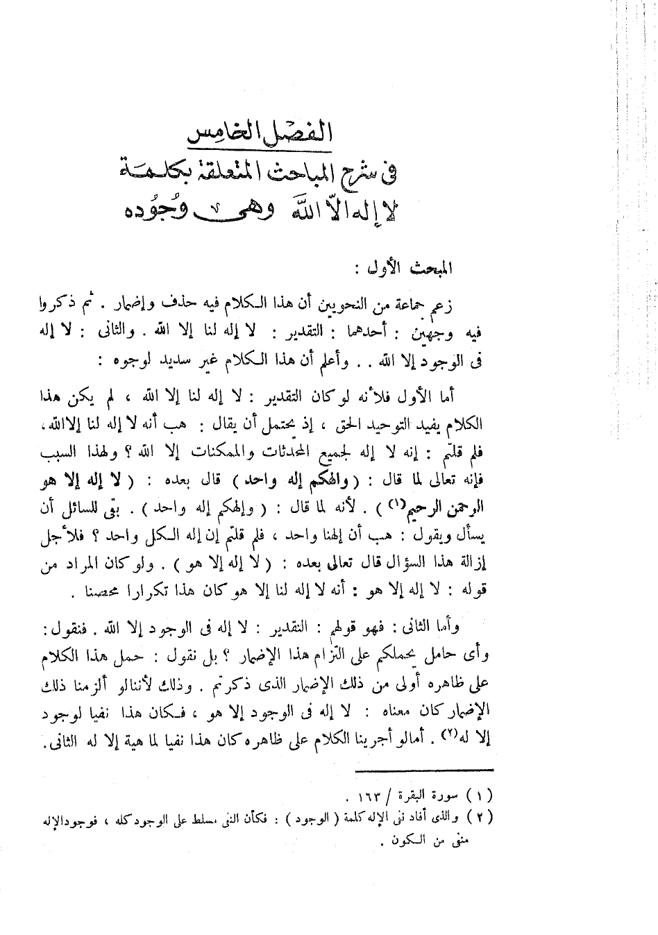 الفصل الخامس: فى شرح المباحث المتعلقة بكلمة لا إله إلا الله