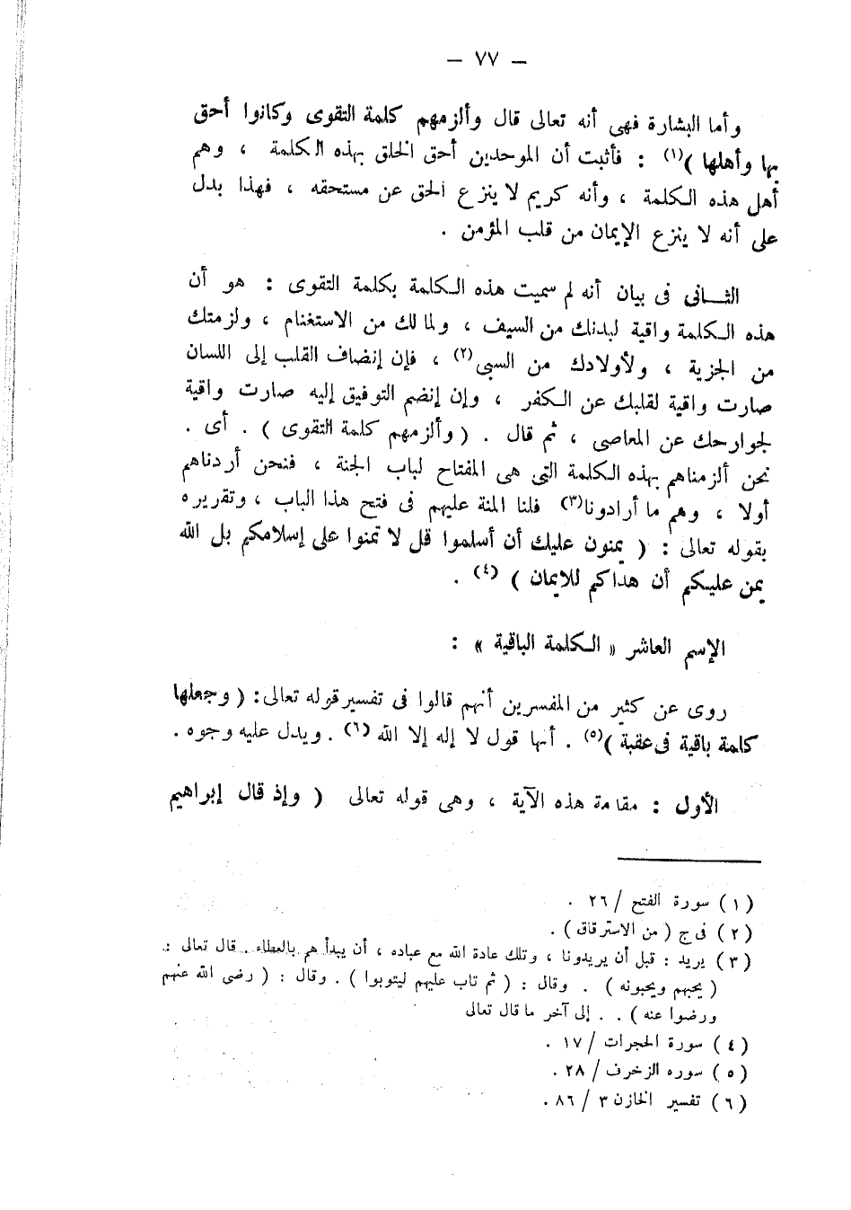 الثانى : فى بيان أنه لم سميت هذه الكلمة بكلمة التقوى : هو أن هذه الكلمة واقية لبدنك من السيف ، ولمالك من الا ستغنام ، ولذمتك من الجزية ، ولأولادك من السبى ، فإن إنصاف القلب إلى اللسان صارت واقية لقلبك عن الكفر ، إن إنضم التوفيق إليه صارت واقية لجوارحك عن المعاصى ، ثم قال :