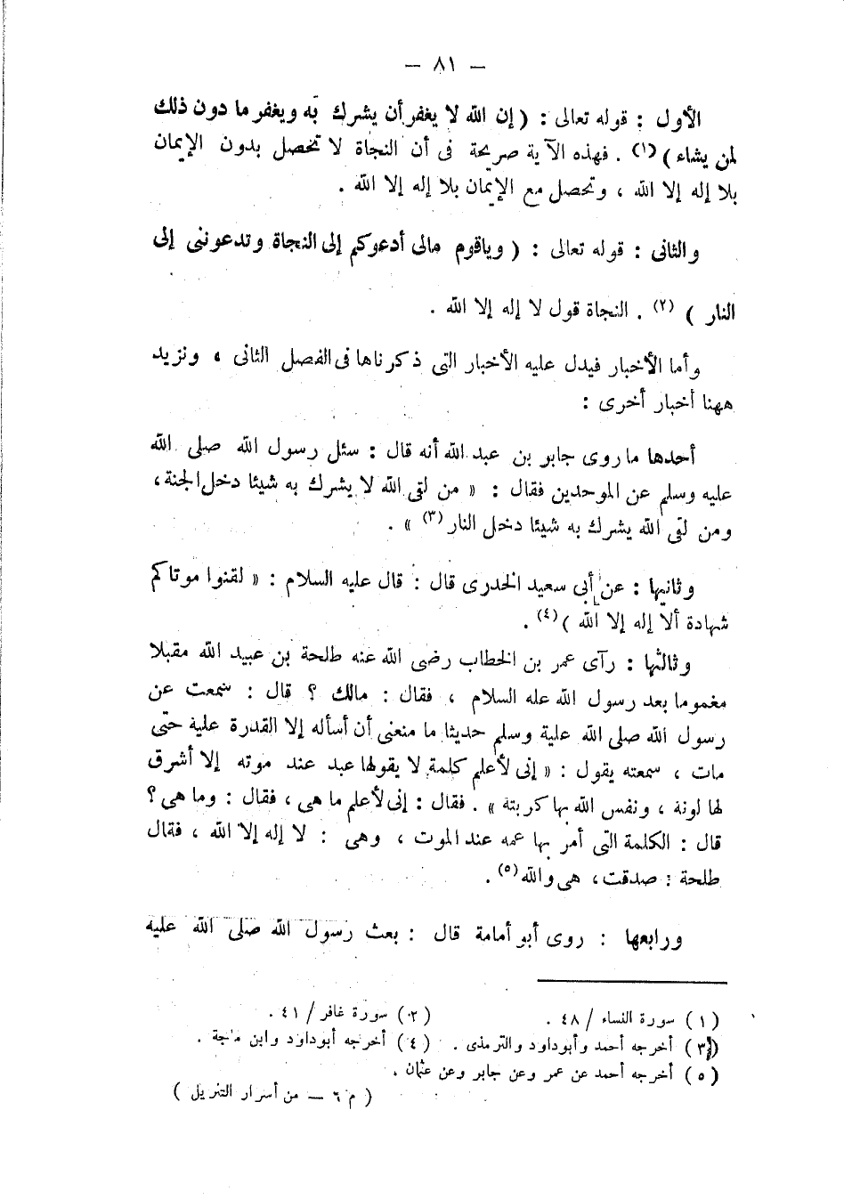 الأول: قوله تعالى: (إِنَّ اللَّهَ لَا يَغْفِرُ أَنْ يُشْرَكَ بِهِ وَيَغْفِرُ مَا دُونَ ذَلِكَ لِمَنْ يَشَاءُ). فهذه الآية صريحة فى أن النجاة لا تحصل بدون الإيمان بلا إله إلا الله، وتحصل مع الإيمان بلا إله إلا الله.