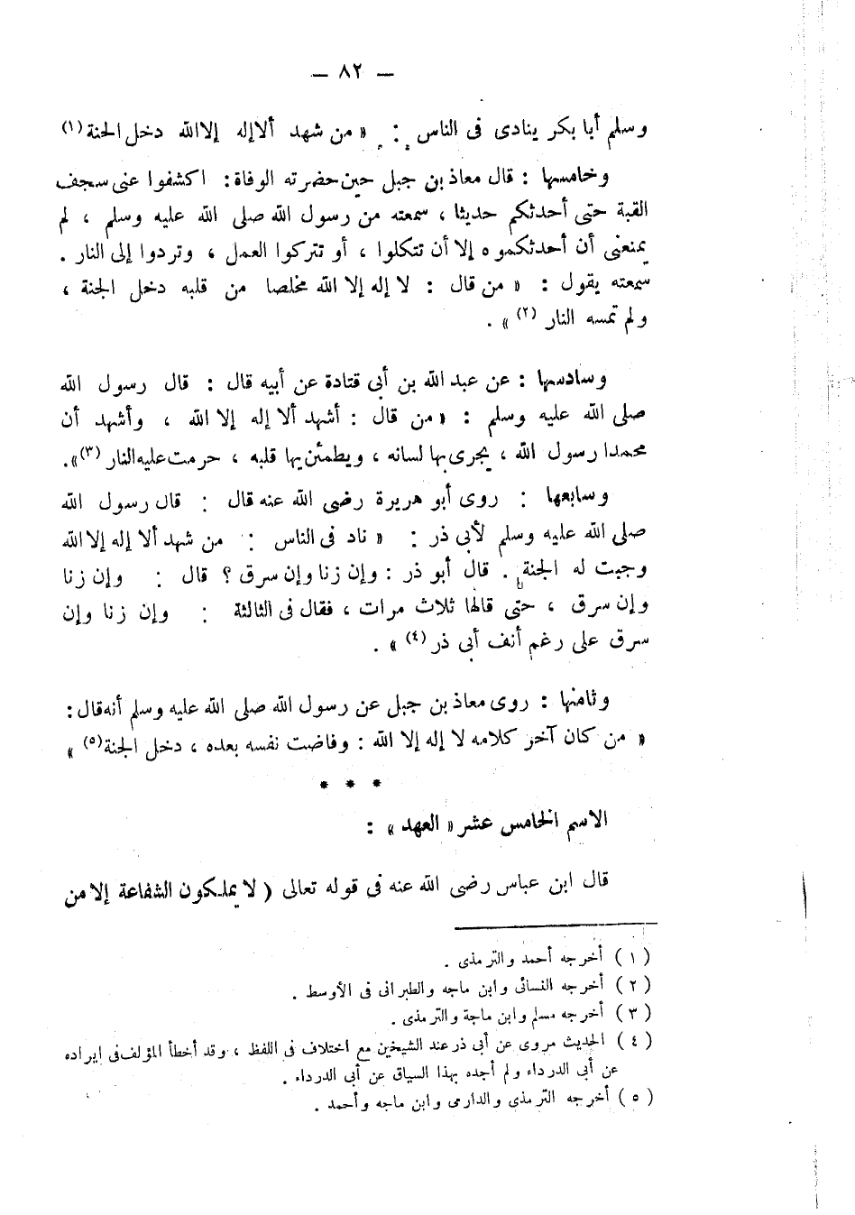 وخامسها : قال معاذ بن جبل حين خضرته الوفاة : اكشفوا عنى سجف القبة حتى أحدثكم حديثاً ، سمعته من رسول الله صلى الله عليه وسلم ، لم يمنعنى أن أحدثكموه إلا أن تتكلوا ، أو تتركوا العمل ، وتردوا إلى النار. سمعته يقول : "من قال لا إله إلا الله مخلصاً من قلبه دخل الجنة ، ولم تمسه النار".