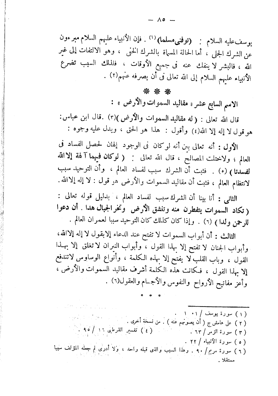 الأول : أنه تعالى بين أنه لو كان فى الوجود إلهان لحصل الفساد فى العالم ، ولاختلت ، قال الله تعالى : ( لَوْ كَانَ فِيهِمَا آلِهَةٌ إِلَّا اللَّهُ لَفَسَدَتَا ) فثبت أن الشرك سبب لفساد العالم ، وأن التوحيد سبب لانتظام العالم فسبت أن مقاليد السموات والأرض هو قول : لا إله إلا الله