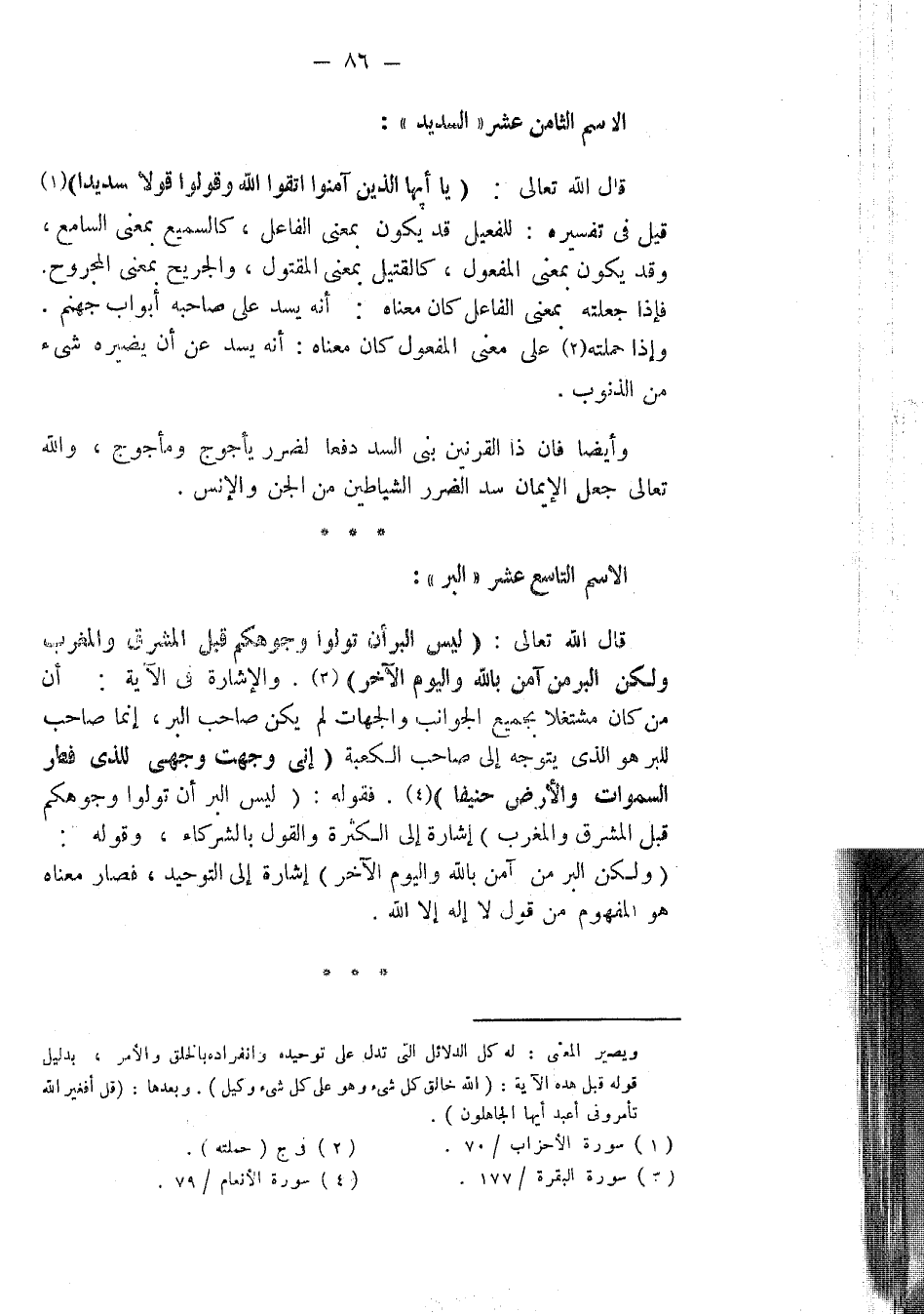 فقوله : (لَيْسَ الْبِرَّ أَنْ تُوَلُّوا وُجُوهَكُمْ قِبَلَ الْمَشْرِقِ وَالْمَغْرِبِ). إشارة إلى الكثرة والقول بالشركاء ، وقوله : (وَلَكِنَّ الْبِرَّ مَنْ آمَنَ بِاللَّهِ وَالْيَوْمِ الْآخِرِ ) إشارة إلى التوحيد فصار معناه هو المفهوم من قول لا إله إلا الله .